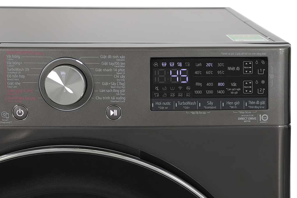 • Sản phẩm có hiệu suất sử dụng điện 25.48Wh/kg, đạt 5 sao về nhãn năng lượng. Công nghệ tiết kiệm nước/bột giặt/thời gian Công nghệ AI DD: Có thể tự động cảm nhận độ mềm của sợi vải và tối ưu quá trình giặt, nhằm bảo vệ quần áo tốt hơn đến 18%. Tiện ích - Hẹn giờ giặt kết thúc: Cho phép bạn tùy chỉnh thời gian kết thúc giặt giũ, thuận tiện cho việc sắp xếp thời gian cá nhân và hạn chế tình trạng đồ bị hôi do để bên trong lồng giặt quá lâu. - Khóa trẻ em: Tránh nghịch phá và đảm bảo an toàn cho trẻ nhỏ cũng như giúp cho quy trình giặt giũ diễn ra trơn tru mà không bị ảnh hưởng bởi các nhân tố bên ngoài. - Điều khiển từ xa qua ứng dụng LG ThinQ: Cài đặt ứng dụng LG ThinQ trên điện thoại, bạn có thể điều khiển từ xa các chức năng và kiểm soát máy giặt LG nhanh chóng, bất kỳ khi nào.
