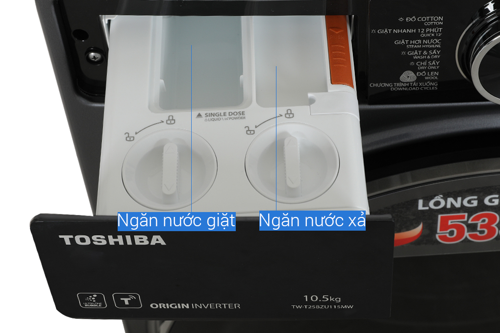 - Lồng giặt bằng thép không gỉ, khả năng chống oxy hoá tốt, hạn chế gỉ sét, vi khuẩn và mảng bám tích tụ lâu ngày, đảm bảo máy hoạt động bền bỉ hơn. *Hình ảnh chỉ mang tính chất minh họa Khối lượng giặt và chương trình giặt - Máy giặt Toshiba có khối lượng giặt 10.5 kg, phù hợp với gia đình trên 7 thành viên hoặc gia đình ít thành viên hơn nhưng nhu cầu giặt giũ hàng ngày cao.