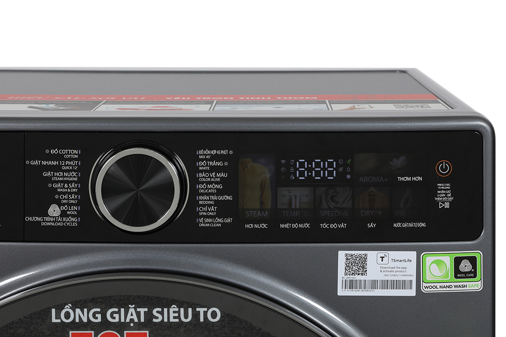 - Bảng điều khiển cảm ứng song ngữ Anh Việt có nút nhấn, màn hình hiển thị rõ nét, tiện lợi và linh hoạt khi lựa chọn chương trình giặt.