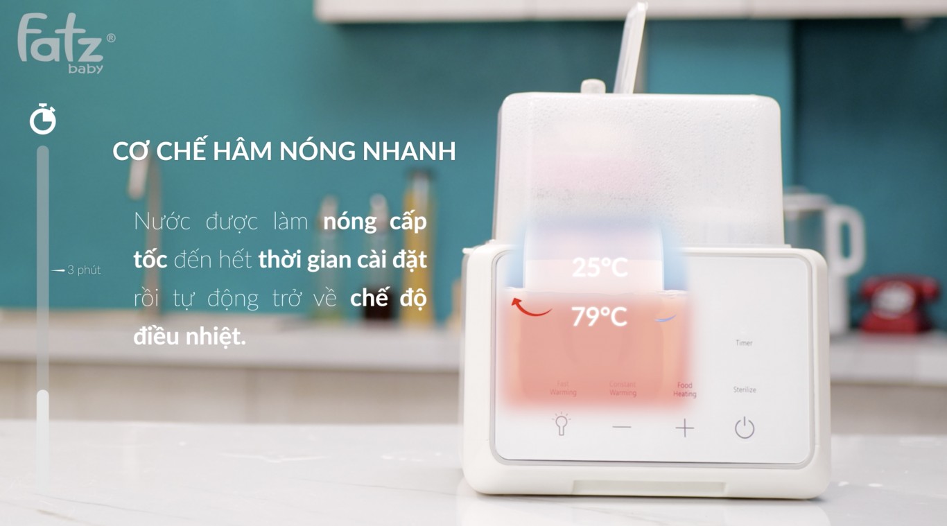 Hâm nóng nhanh được sử dụng khi bạn cần gấp sữa ấm cho bé trong thời gian ngắn nhất. Nguyên tắc của việc hâm nóng này là máy sẽ dùng nhiệt cao để làm nóng nước trong khoang hâm sữa, trong khi đó sữa trong bình chưa có đủ thời gian để đạt được nhiệt độ cao trong một thời gian quá ngắn. Nhiệt độ của nước trong khoang hâm nóng có thể đạt 50oC (sau 5 phút) hoặc thậm chí 70oC (sau 10 phút) chính vì vậy sữa sẽ được hâm nóng nhanh. Lưu ý rằng, bạn không nên cài đặt thời gian hâm nhanh quá lâu đối với sữa trên 20oC. Vì như vậy sữa có thể bị quá nóng và bị mất chất.