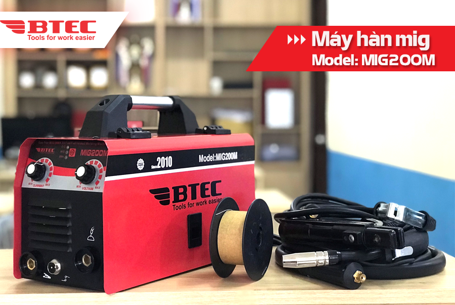 Máy hàn Mig mini không dùng khí BTEC 200M là dòng máy hàn biến thể của Máy hàn Mig không dùng khí BTEC MIG/MMA-200S 4 chức năng với chỉ 2 chức năng chuyên dụng là hàn Mig và hàn que.Máy được tối ưu chuyên dụng cho hàn mig với cuộn dây lõi thuốc 1kg,gọn nhẹ hơn,vận hành ổn định hơn.