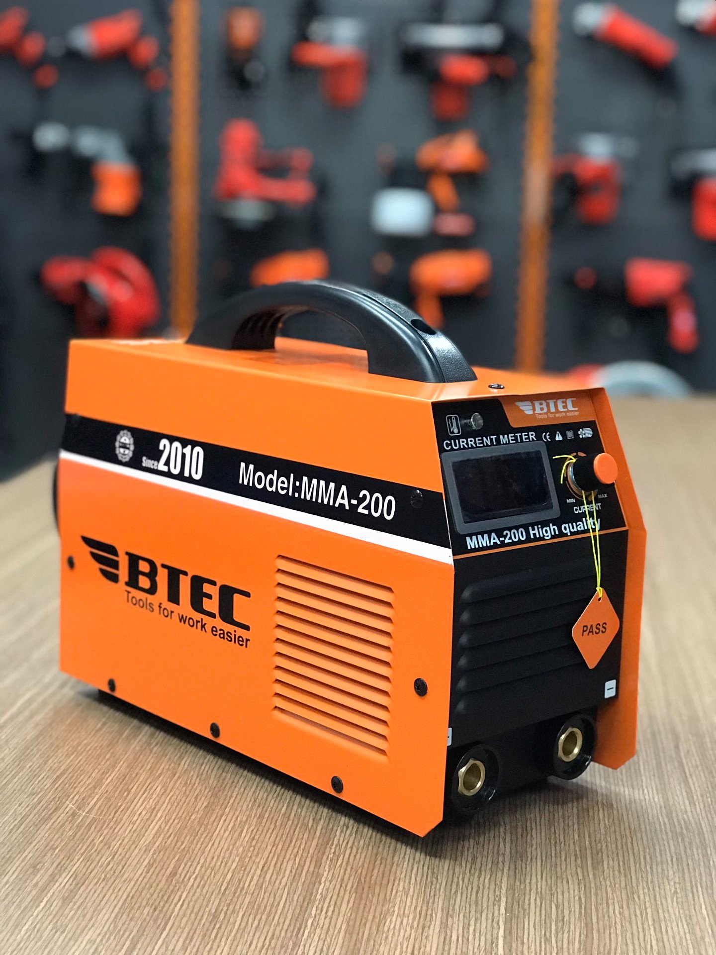 Mặt trước của máy hàn điện tử BTEC MMA-200 (xác lớn): 2 giác cắm dây hàn và dây mass đều là giác lớn, mã máy ( MMA-200 High quality), đồ hồ hiện thị dòng ra, núm điều chỉnh dòng hàn, đèn báo khi máy làm việc quá hiệu suất.