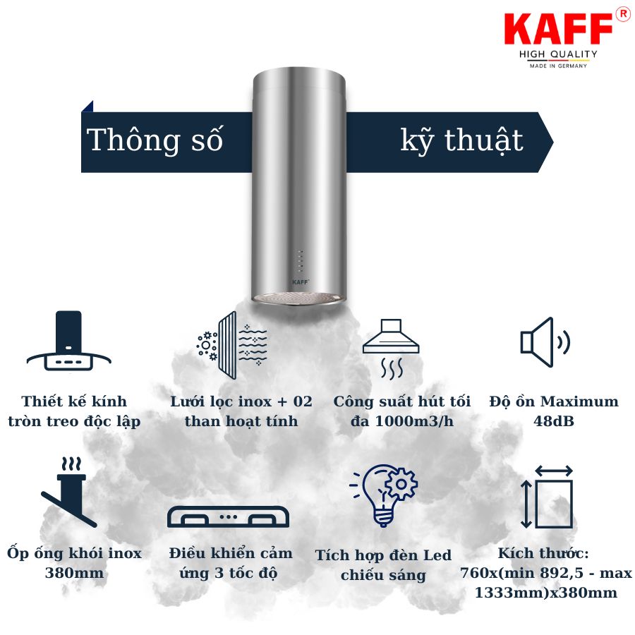 Máy hút mùi cổ điển Kaff Thương hiệu Đức tiêu chuẩn Châu Âu Thân làm bằng thép sơn tĩnh điện Động cơ đôi 2 x 80W Bóng đèn Halogen 2 x 40W Điều khiển bằng
