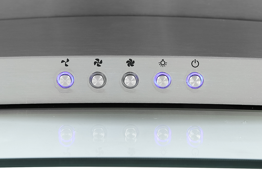 ĐẶC TÍNH SẢN PHẨM Hút mùi kiểu dáng kính cong Chất liệu kính, inox cao cấp Mặt kính cường lực sang trọng Điều khiển điện tử 3 tốc độ Lưới lọc Inox + than hoạt