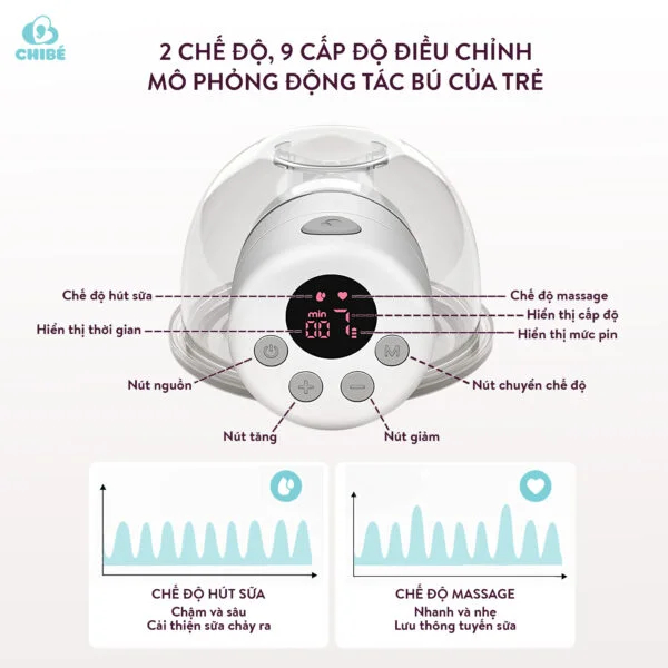 - 2 chế độ là hút và massage. 9 cấp độ mạnh nhẹ giúp lấy được tối đa sữa mẹ, làm thông thoáng tia sữa