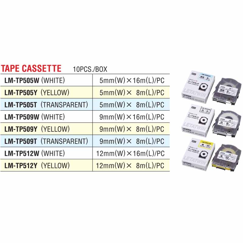 In băng nhãn chính hiệu của MAX plastic: 5mm, 9mm, 12mm; với 3 màu vàng, trắng và trong suốt được sản xuất tại Nhật với loại keo đặt biệt bền với môi trường.