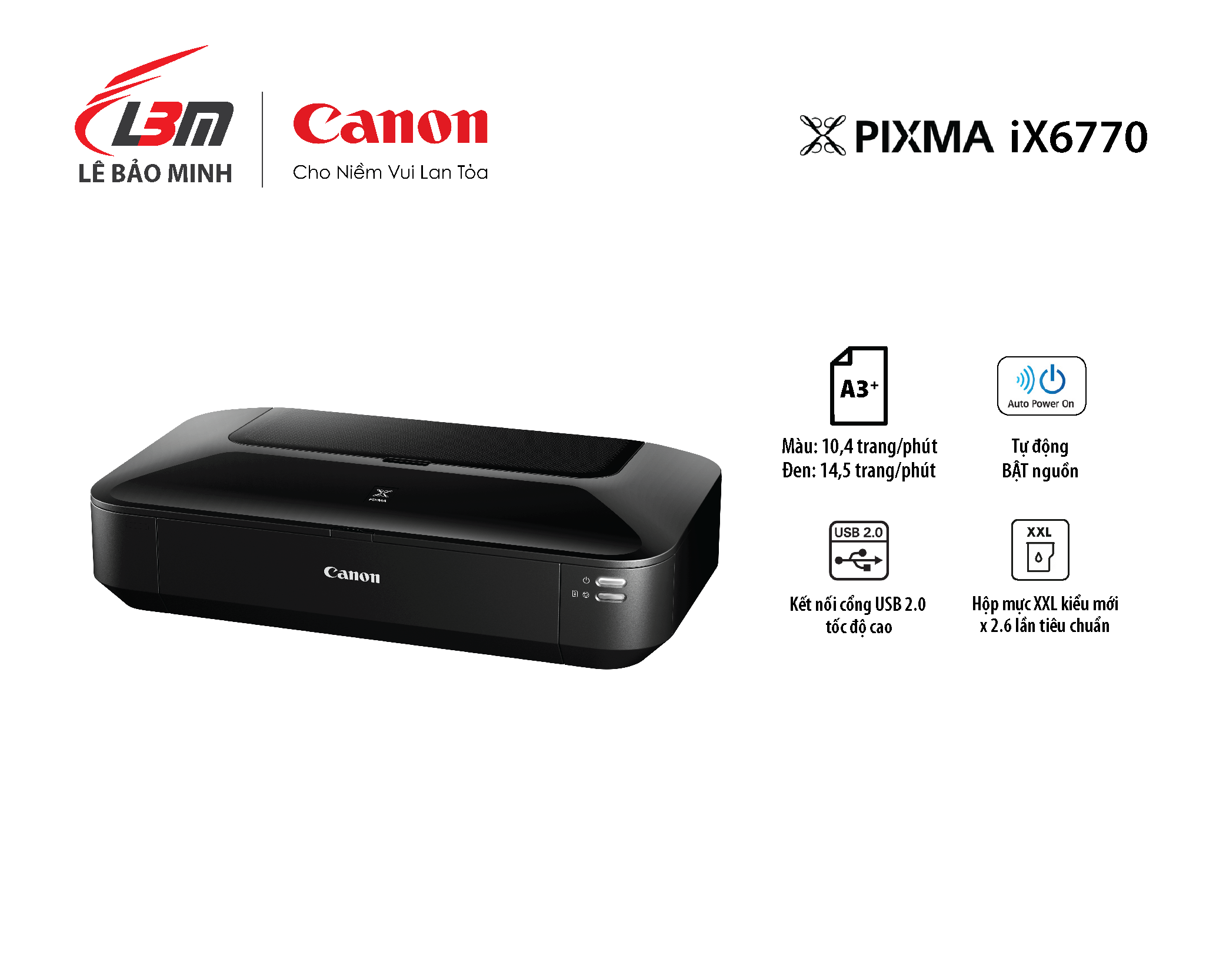 - Lượng bản in khuyến nghị theo tháng: 80 - 200 trang Tính năng Tính năng tự động BẬT nguồn Tính năng tự động BẬT nguồn sẽ dò tìm lệnh in và tự động bật máy in có kết nối USB. Hộp mực riêng biệt kiểu mới Hộp mực XXL kiểu mới có thể in gấp 2,6 lần dung lượng bản in so với các ống mực chuẩn Mẫu giải pháp Bạn có thể tải các mẫu giải pháp được thiết kế riêng (như menu, đề xuất bán hàng và kí hiệu văn phòng khác) cho các mục đích sử dụng riêng biệt với chiếc máy in này thông qua Quick Menu. In tài liệu cỡ A3 Bạn sẽ có lợi thế trong cuộc cạnh tranh kinh doanh. Bởi iX6770 có thể in các bản in khổ rộng có độ phân giải cao và in bản vẽ CAD lên tới khổ A3.