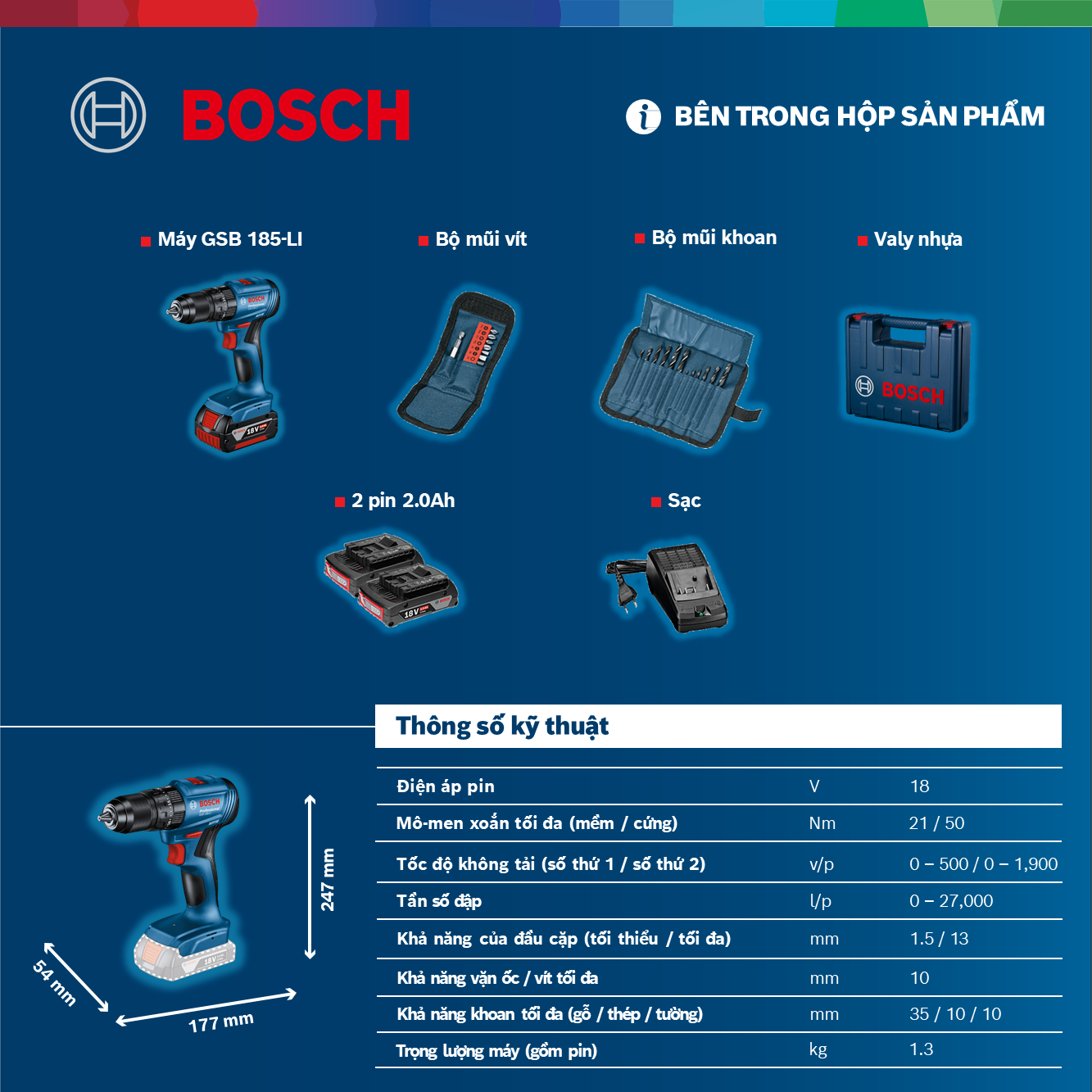 Máy khoan Bosch 18V GSB 185 LI sử dụng động cơ không chổi than Mô men xoắn 50NM Chính hãng
