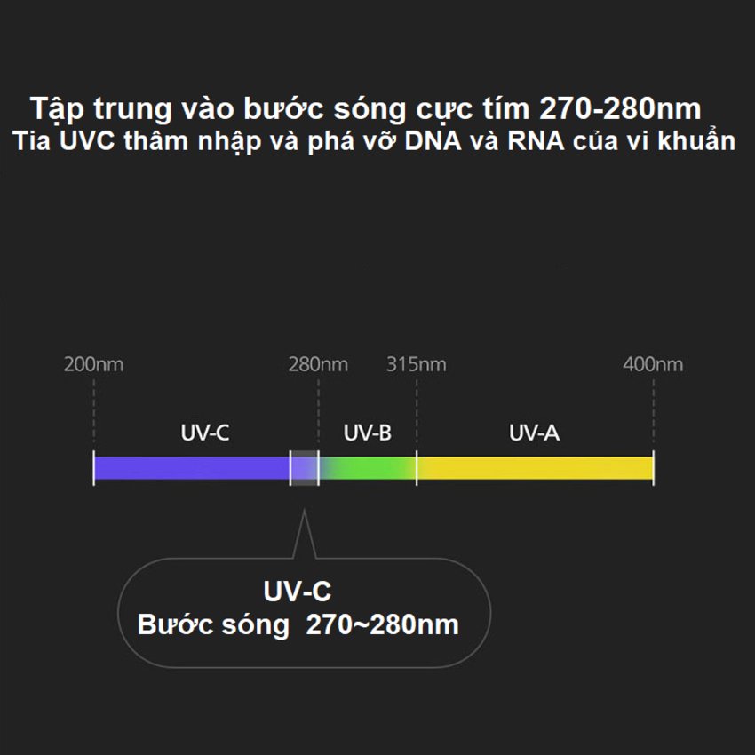 - Đèn led khử trùng bằng tia cực tím UVC, diệt khuẩn trong vòng 6 phút, loại bỏ tới 99.9% các loại Virus. Hiệu suất