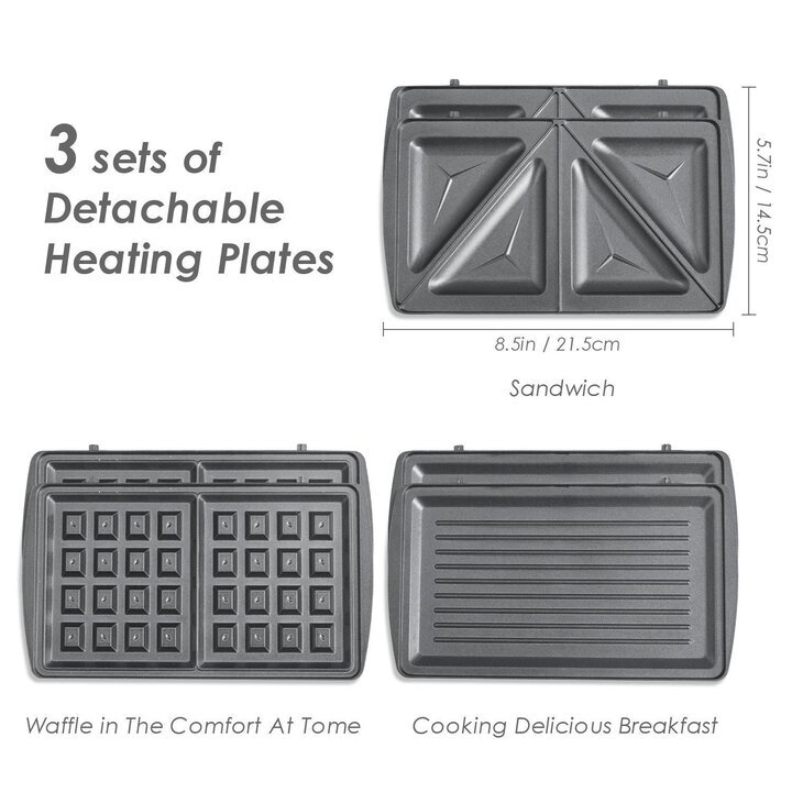 Máy nướng 3 trong 1 Máy làm bánh 3 trong 1 Tiross TS513 với 3 loại vỉ nướng đi kèm, bạn có thể làm các loại bánh khác nhau như bánh sandwich, bánh waffle, bánh