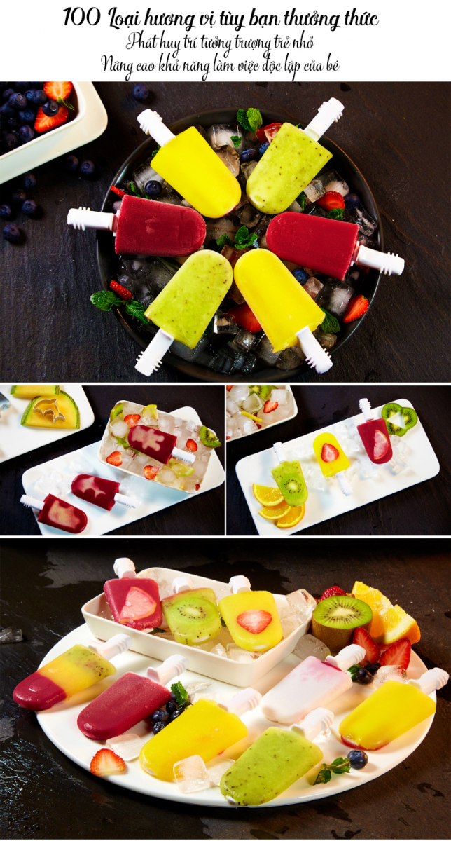 Ngoài thao tác sử dụng nước ép trái cây để làm kem, bạn cũng có thể linh động trộn lẫn nhiều loại trái cây, bánh cookie hay xen kẽ những miếng trái cây tươi ngon vào cây kem sẽ giúp kích thích thị giác và vị giác của trẻ- đó cũng là cách bạn bổ sung các chất dinh dưỡng cần thiết cho trẻ vào những ngày hè nắng nóng