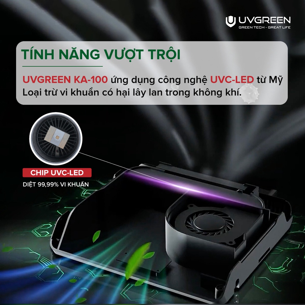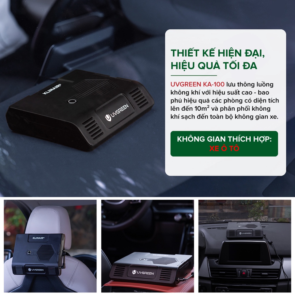 Máy Lọc Không Khí Ô Tô, Khử Mùi, Diệt Khuẩn UVGREEN KA100 - Công Nghệ UVC LED Từ Mỹ, Lõi Lọc Than Hoạt Tính Lọc Bụi Mịn, Loại Bỏ Mùi - Bảo Hành 12 Tháng — THÔNG SỐ KỸ THUẬT: • Công suất lọc (CADR): 10m3/h • Diện tích sử dụng: xe hơi • Nơi sử dụng lý tưởng: Ô tô • Điện áp: 12V • Nguồn điện: Tẩu sạc xe hơi • Mức tiêu thụ điện: 2W • Độ ồn tối thiểu - tối đa: 25-40 dB • Tốc độ gió 3 mức: Thấp - Cao - Tự Động • Kích thước (D x R x C): 20 x 18 x 4.5 cm • Trọng lượng tịnh: 720g ~ 1,59lb • Bộ sản phẩm bao gồm: 1 máy lọc không khí, 1 bộ lọc Than Hoạt Tính (được cài đặt sẵn), 2 bộ diệt khuẩn True UVC ( đã cài đặt sẵn), 1 bộ cấp nguồn, 1 phiếu bảo hành, 1 sách HDSD. — CÔNG NGHỆ VƯỢT TRỘI - HIỆU QUẢ TỐI ƯU: Diệt khuẩn bằng Công nghệ UVC LED bởi Bolb Inc tại Mỹ với hiệu suất diệt khuẩn 99.99%. • Các dòng sản phẩm Máy Lọc Không Khí UVGREEN được ứng dụng công nghệ UVC LED tiên tiến hàng đầu thế giới. UVC LED phát ra tia cực tím ở bước sóng ổn định, diệt khuẩn mạnh mẽ với tuổi thọ lên tới 10.000 giờ. Được kiểm chứng đạt các tiêu chuẩn của Châu Âu về an toàn hóa học cho người dùng bao gồm RoHS, REACH và an toàn Ozone.     — TÍNH NĂNG SẢN PHẨM: Thiết kế tinh tế sang trọng, nhỏ gọn thích hợp cho xe hơi: Máy lọc không khí UVGREEN KA100 với thiết kế hình hộp chữ nhật kết hợp với màu đen đơn giản nhưng không kém phần tinh tế, sang trọng. Vỏ máy lọc không khí được làm bằng nhựa và được thiết kế liền mạch, không chỉ giúp bảo vệ các bộ phận bên trong máy mà còn bảo vệ an toàn người sử dụng nhất không gian bên trong xe ô tô.   Được trang bị màng lọc Than Hoạt Tính lọc bụi mịn và mùi hôi hiệu quả: Màng lọc than hoạt tính có hiệu quả lọc tốt giữ lại: Khói thuốc, khói ô nhiễm; các chất hữu cơ gây dị ứng và mùi thức ăn để cung cấp một luồng không khí sạch, trong lành.. • Thời gian thay thế: 3~6 tháng.     Chỉ với 1 nút nhấn: Dễ dàng điều chỉnh cấp độ gió phù hợp với 3 cấp độ bằng một nút bấm. Chế độ Thấp: Máy vận hành êm ái, với độ ồn thấp giúp bạn và gia đình có giấc ngủ sâu và ngon hơn. Chế độ Cao: tốc độ hoạt động lọc không khí nhanh hơn. *Chế độ Tự Động: Tự điều chỉnh tốc độ lọc theo chỉ số ô nhiễm không khí theo thời gian thực. Đèn UV giúp loại bỏ 99.99% các loại vi khuẩn, virus trong không khí.     — CHÍNH SÁCH BẢO HÀNH Chi tiết xem trên Phiếu Bảo Hành khi mua hàng. Bảo hành 12 tháng đối với Thiết Bị/ 12 tháng đối với chip UVC LED. Đổi, trả hàng trong vòng 7-15 ngày nếu sản phẩm không đúng như mô tả. Đổi mới nếu sản phẩm phát sinh lỗi do nhà sản xuất. — UVGREEN là chuyên gia về sản phẩm gia dụng ứng dụng công nghệ diệt khuẩn hiện đại.   Tầm nhìn thương hiệu: Trở thành biểu tượng niềm tin hàng đầu Việt Nam về sản phẩm công nghệ thông minh bảo vệ sức khỏe con người.   Sứ mệnh thương hiệu: UVGREEN cam kết mang đến cho mọi gia đình Việt các sản phẩm công nghệ hướng đến bảo vệ sức khỏe toàn diện. Trên nền tảng công nghệ diệt khuẩn UVC hiện đại, chúng tôi nỗ lực loại bỏ các rủi ro với sức khỏe người tiêu dùng, mang đến cho mọi gia đình Việt một không gian sống sạch và yên vui. __