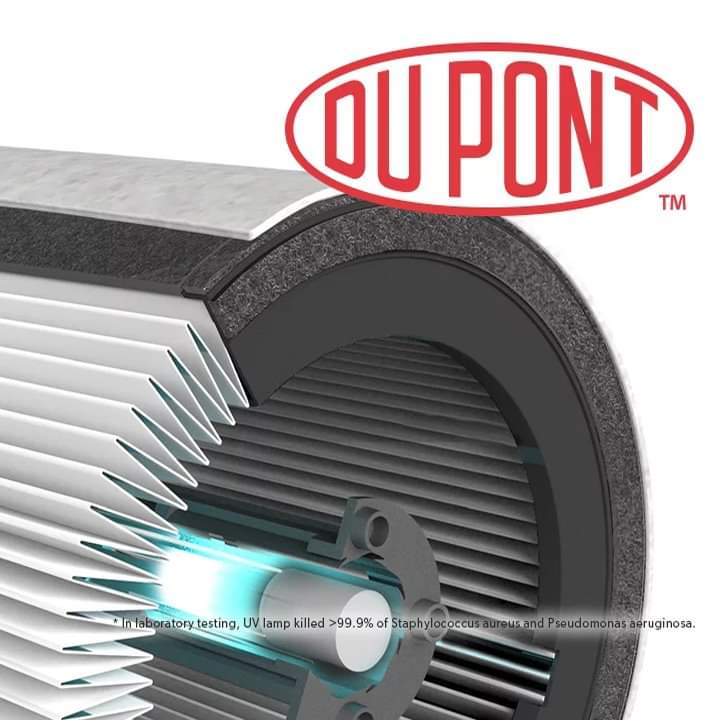 • Bộ lọc DuPont HEPA 360 độ thu giữ các chất ô nhiễm và khí/mùi VOC từ mọi hướng. Ánh sáng tia cực tím giết chết vi trùng và vi khuẩn có thể bị mắc kẹt trong bộ lọc.