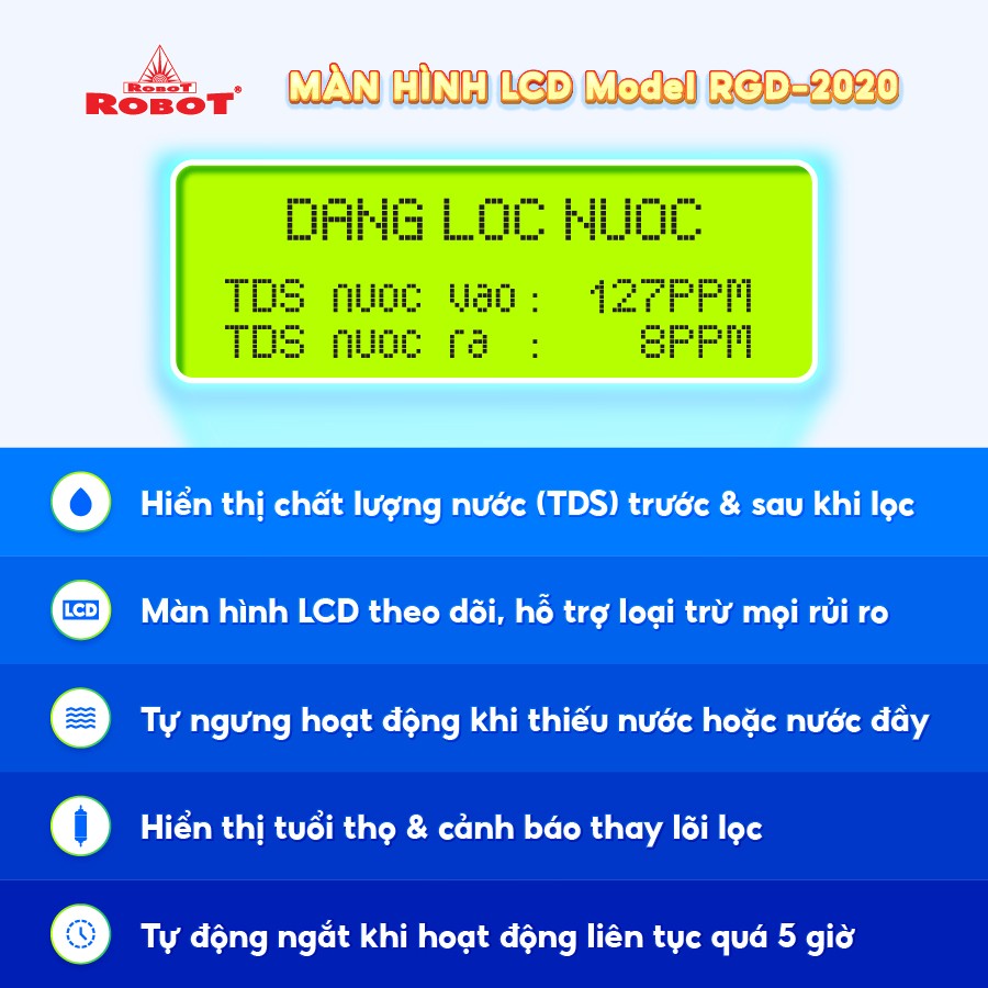 - Các sản phẩm máy lọc nước ROBOT đều sở hữu màn hình LCD sắc nét, hiển thị chi tiết các thông số TDS – chất lượng nước trước & sau lọc, tuổi thọ lõi lọc 24/24… để mọi người đều dễ dàng theo dõi hoạt động máy, chất lượng nước uống thông qua màn hình LCD, loại trừ mọi rủi ro, mang đến sự an toàn tuyệt đối khi sử dụng.