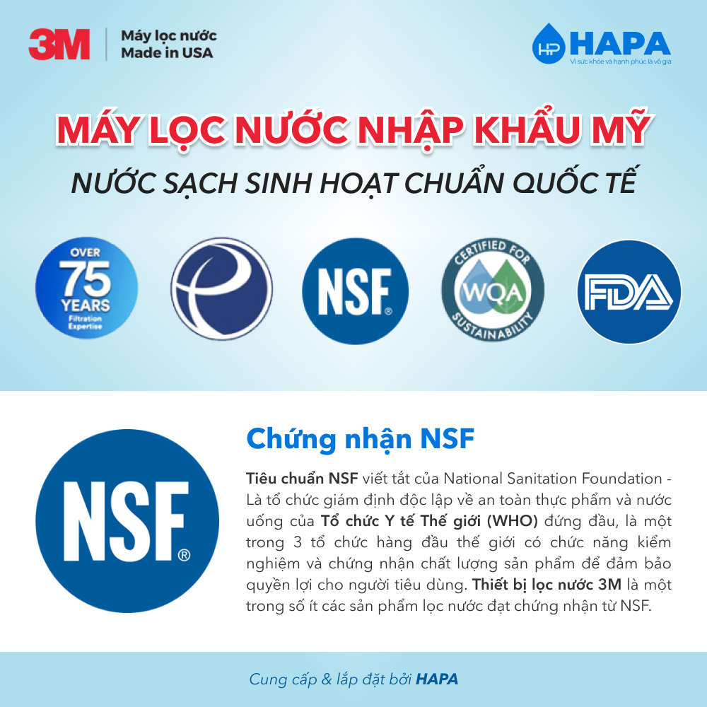 - Nước sau lọc đạt chuẩn quốc tế NSF (của WHO), Hiệp hội WQA, Viện Pasteur, Bộ Y Tế.