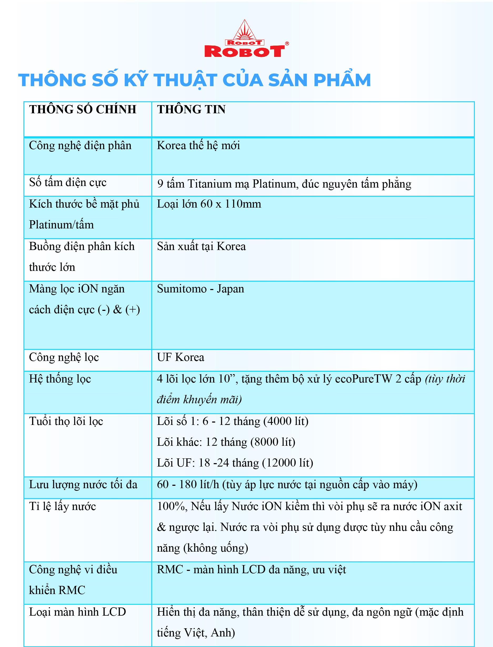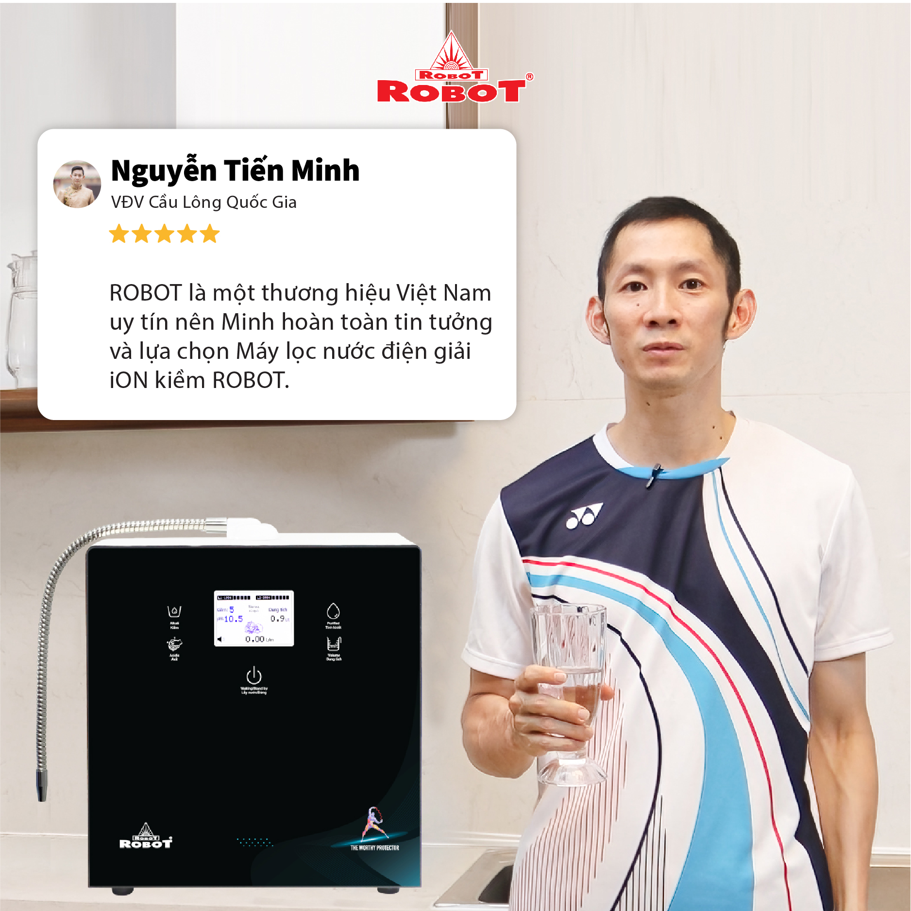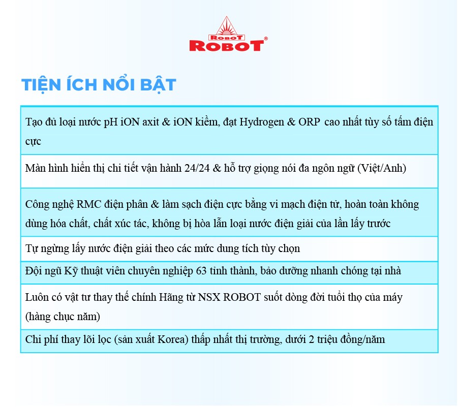 - Hệ thống điều khiển cảm ứng trên mặt phủ kính với màn hình LCD tinh tế ️ Với mong muốn nhiều gia đình Việt có thể sử dụng nước điện giải iON kiềm với chi phí hợp lý để bảo vệ sức khỏe, sắc đẹp & nâng cao chất lượng cuộc sống, ROBOT mang đến sản phẩm “Chất lượng Quốc tế - Giá thành Việt Nam”, phù hợp với mức sống của nhiều người. Tiết kiệm cho người tiêu dùng đến hơn một nửa chí phí so với máy nhập khẩu chỉ từ 30 - 50%, nhưng sở hữu nhiều ưu điểm, tính năng vượt trội, chất lượng cao. Chế độ bảo hành chính hãng, tận nơi, vật tư và linh kiện, lõi lọc luôn có sẵn hạn chế tối đa chi phí sửa chữa, bảo trì. +VĐV Cầu Lông Nguyễn Tiến Minh – tay vợt từng đứng Top 5 Thế Giới chia sẻ: Sau một thời gian sử dụng Máy lọc nước điện giải iON kiềm Minh thấy cải thiện sức khỏe rất nhiều và tốc độ hồi phục sau tập luyện, thi đấu cũng nhanh hơn so với trước đây. Bây giờ mỗi khi đi tập, hay khi đi thi đấu, Minh đều mang theo nước iON kiềm để uống. ROBOT là một thương hiệu Việt Nam uy tín nên Minh hoàn toàn tin tưởng và lựa chọn Máy lọc nước điện giải iON kiềm ROBOT. ️Thông Tin Thương Hiệu CÔNG TY CỔ PHẦN ĐẦU TƯ ROBOT