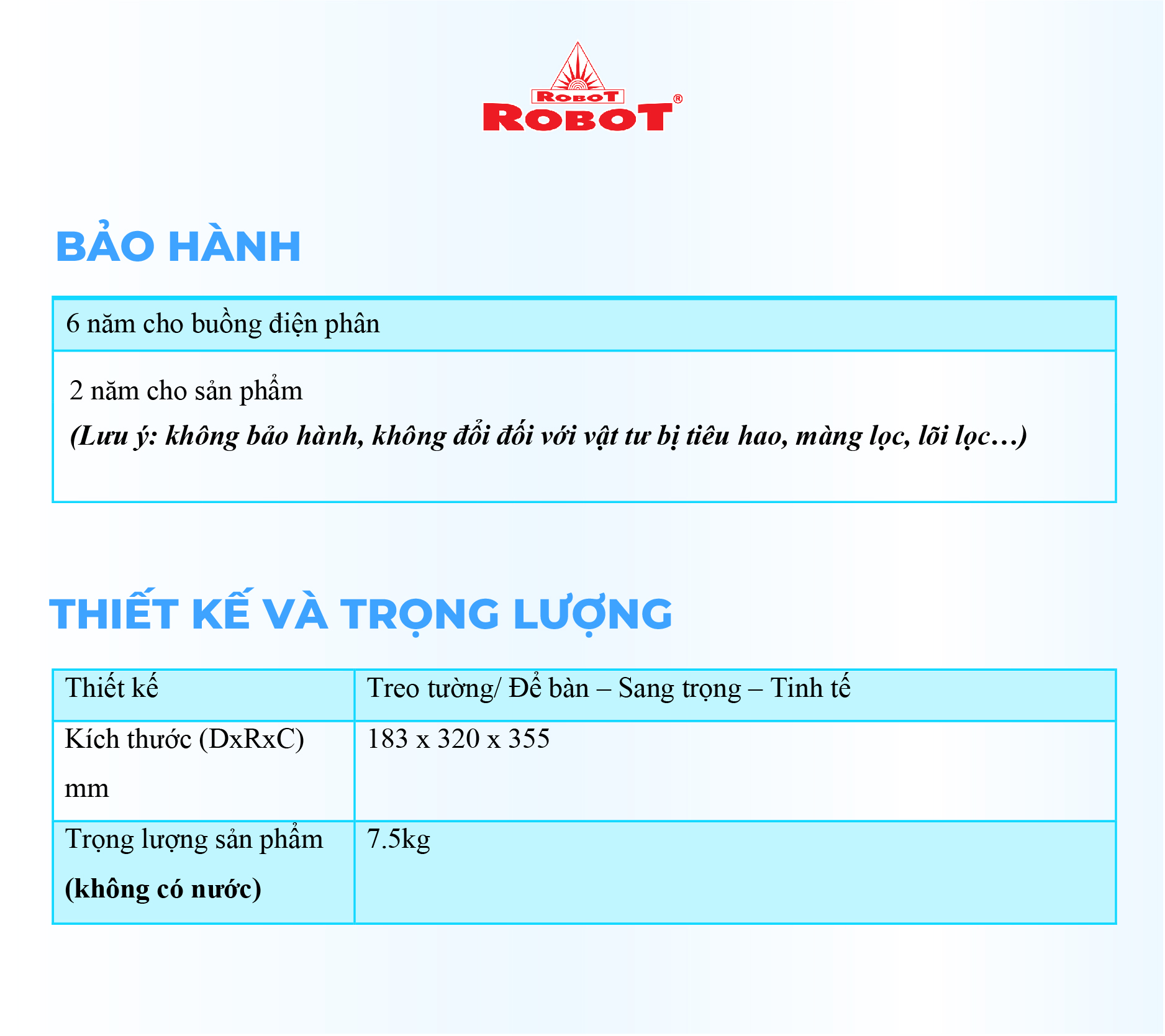 - Từ nền tảng vững chắc, ROBOT đã chuyển mình mạnh mẽ, mở rộng sản xuất, cung ứng thêm các sản phẩm mới : Máy làm mát, máy lọc không khí & Máy lọc nước, để mang đến cho người tiêu dùng những sản phẩm không chỉ