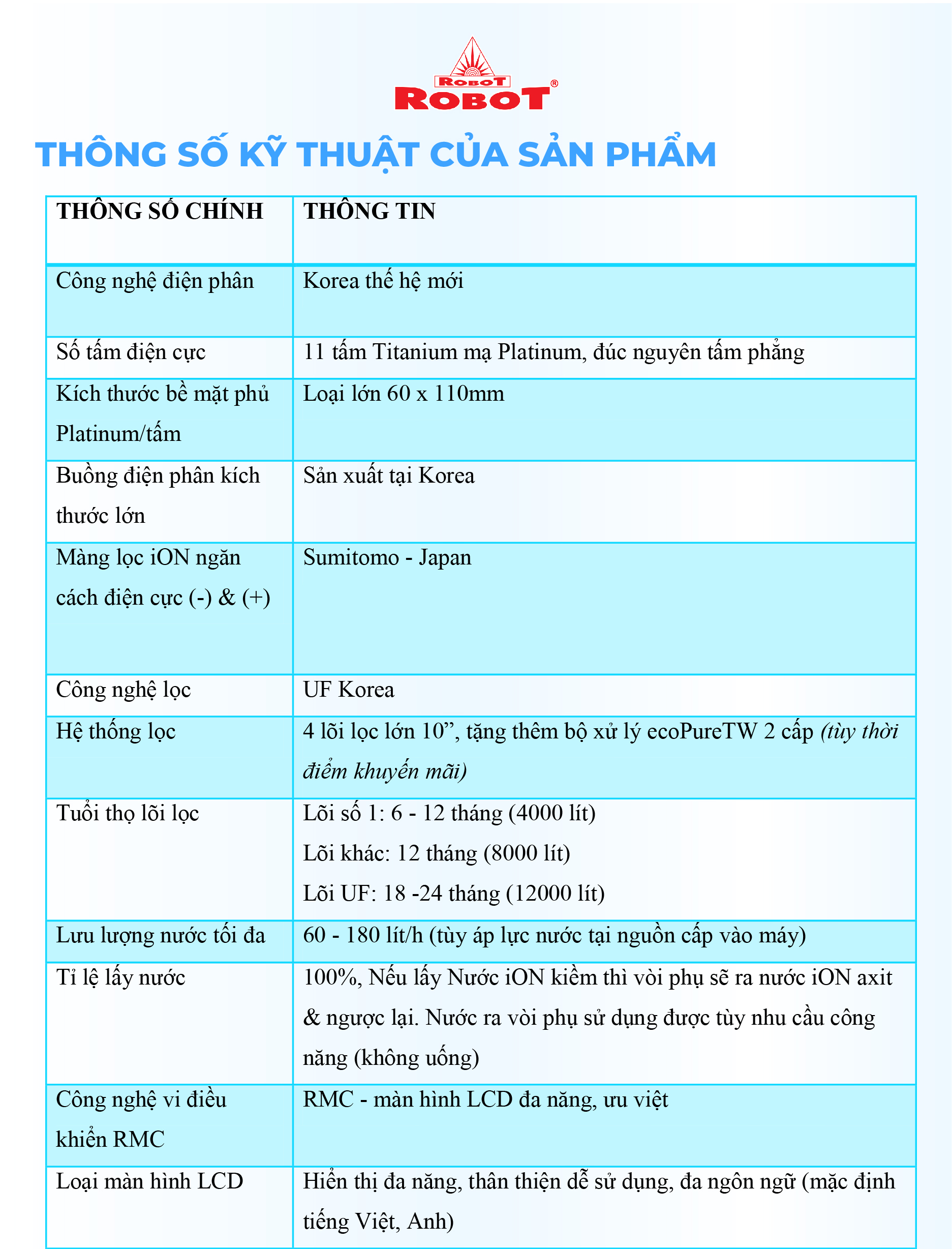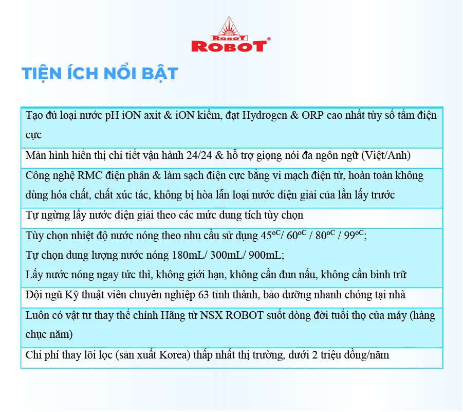 - Và 4 mức nước iON axit (pH 3.5/4.0/4.5/5.5). Chất lượng nước đạt chỉ số tối ưu, nồng độ Hydro hoạt tính lên đến ~ 1500 -> 1800 ppb, chống oxy hóa (ORP) lên đến ~ -850 -> -1000 mV, đáp ứng mọi nhu cầu sử dụng trong cuộc sống. Máy lọc nước điện giải iON kiềm Nóng Lạnh ROBOT ionQueen là dòng Để Bàn đầu tiên trên thế giới, được thiết kế kiểu dáng hiện đại, thiết kế chinh phục mọi không gian. Đặc biệt, được tích hợp thêm chức năng Nóng Thông Minh – Lạnh độc đáo & duy nhất trên thị trường, mang lại nhiều tiện ích cho người dùng. Chỉ số Hydrogen, ORP của nước tùy thuộc số tấm điện cực, đặc tính nguồn nước & “điều kiện đo trong phòng thí nghiệm chuyên nghiệp, đạt chuẩn”. Máy lọc nước điện giải iON kiềm Nóng Lạnh ROBOT ionQueen 1113, tạo 13 loại nước bổ ích, pH 3.5 --> 11.0 - Đáp ứng mọi nhu cầu trong cuộc sống Có thể tham khảo ý kiến của Bác sĩ hoặc chuyên gia dinh dưỡng để được hướng dẫn loại nước uống phù hợp nhất cho cơ thể. Kiểu dáng hiện đại - Thiết kế chinh phục mọi không gian ● Kiểu dáng để bàn, khác biệt so với các dòng điện giải khác ● Sử dụng linh hoạt cho mọi không gian ● Vòi nước điện giải xoay 360° ● Hệ thống điều khiển cảm ứng trên mặt phủ kính với màn hình LCD tinh tế Với mong muốn nhiều gia đình Việt có thể sử dụng nước điện giải iON kiềm với chi phí hợp lý để bảo vệ sức khỏe, sắc đẹp & nâng cao chất lượng cuộc sống, ROBOT mang đến sản phẩm “Chất lượng Quốc tế - Giá thành Việt Nam”, phù hợp với mức sống của nhiều người. Tiết kiệm cho người tiêu dùng đến hơn một nửa chí phí so với máy nhập khẩu chỉ từ 30 – 50%, nhưng sở hữu nhiều ưu điểm, tính năng vượt trội, chất lượng cao. Chế độ bảo hành chính hãng, tận nơi, vật tư và linh kiện, lõi lọc luôn có sẵn hạn chế tối đa chi phí sửa chữa, bảo trì. VĐV Cầu Lông Nguyễn Tiến Minh – tay vợt từng đứng Top 5 Thế Giới chia sẻ: Sau một thời gian sử dụng Máy lọc nước điện giải iON kiềm Minh thấy cải thiện sức khỏe rất nhiều và tốc độ hồi phục sau tập luyện, thi đấu cũng nhanh hơn so với trước đây. Bây giờ mỗi khi đi tập, hay khi đi thi đấu, Minh đều mang theo nước iON kiềm để uống. ROBOT là một thương hiệu Việt Nam uy tín nên Minh hoàn toàn tin tưởng và lựa chọn Máy lọc nước điện giải iON kiềm ROBOT. ️Thông Tin Thương Hiệu CÔNG TY CỔ PHẦN ĐẦU TƯ ROBOT