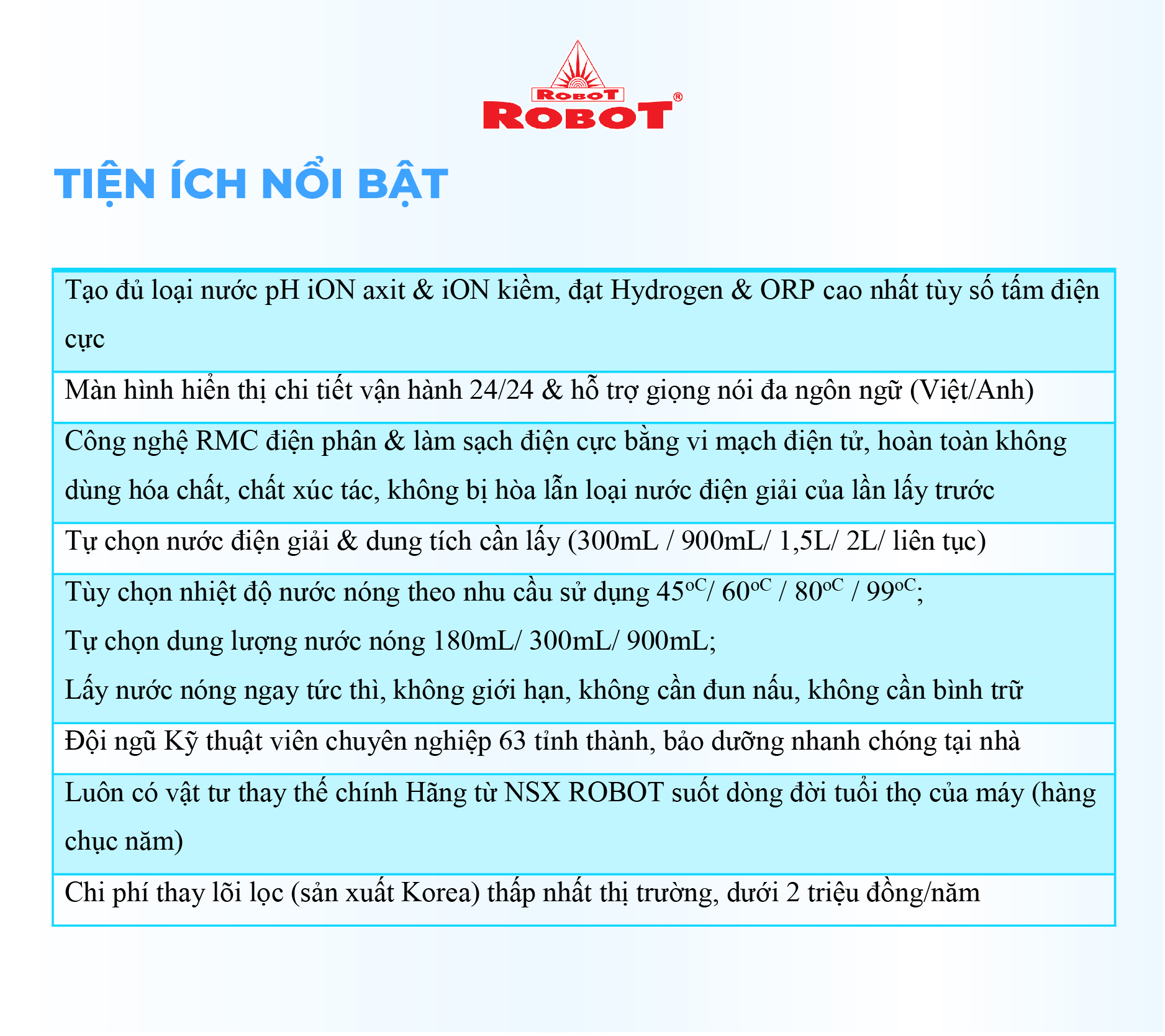 - Với mong muốn nhiều gia đình Việt có thể sử dụng nước điện giải iON kiềm với chi phí hợp lý để bảo vệ sức khỏe, sắc đẹp & nâng cao chất lượng cuộc sống, ROBOT mang đến sản phẩm “Chất lượng Quốc tế - Giá thành Việt Nam”, phù hợp với mức sống của nhiều người. Tiết kiệm cho người tiêu dùng đến hơn một nửa chí phí so với máy nhập khẩu chỉ từ 30 – 50%, nhưng sở hữu nhiều ưu điểm, tính năng vượt trội, chất lượng cao.