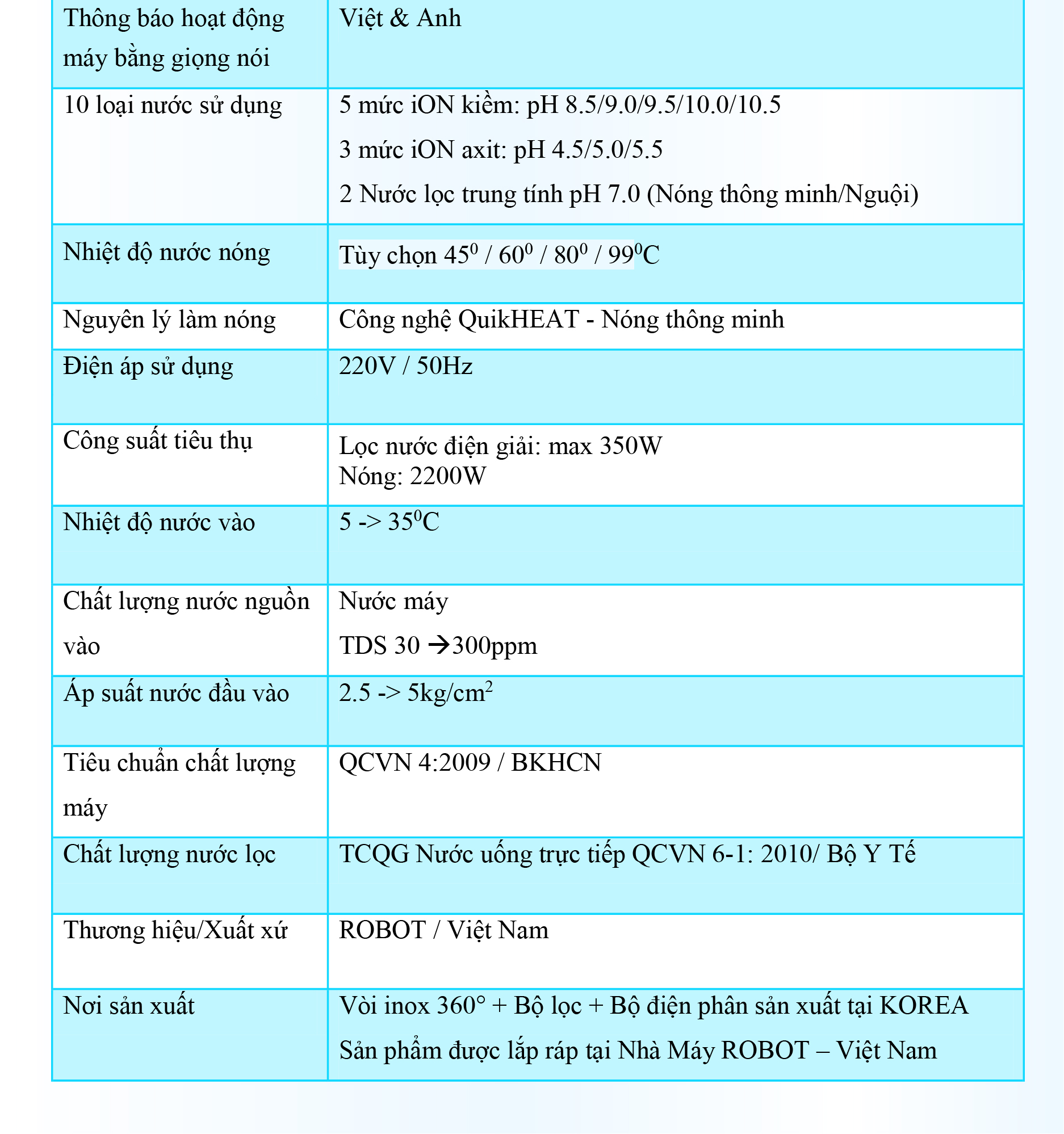 - ️ Máy lọc nước điện giải iON kiềm ROBOT ionSmart 710 là sản phẩm được sản xuất với công nghệ tiên tiến, cao cấp trang bị đến 7 tấm điện cực lớn nhất, có khả năng tạo ra đến 10 loại nước đa chức năng, với 5 mức nước iON kiềm (pH 8.5 – 10.5), nước lọc trung tính (pH 7.0) Nguội – Nóng & 3 mức nước iON axit (pH 4.5 - 5.5). Chất lượng nước đạt chỉ số tối ưu, nồng độ Hydro hoạt tính lên đến ~ 800 - 950 ppb, chống oxy hóa (ORP) lên đến ~ -400 -> -600 mV, đáp ứng mọi nhu cầu sử dụng trong cuộc sống.