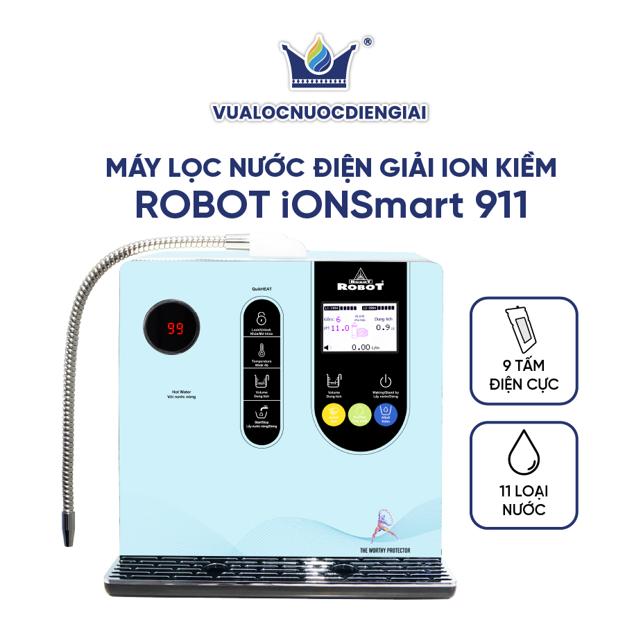 Mua tại TiktokMáy Lọc Nước Điện Giải Ion Kiềm ROBOT IonSmart 911 Nóng Thông Minh - Tạo 11 Loại Nước Máy lọc nước điện giải iON kiềm ROBOT ionSmart 911 là sản phẩm được sản xuất với công nghệ tiên tiến, cao cấp trang bị đến 9 tấm điện cực lớn nhất, có khả năng tạo ra đến 11 loại nước đa chức năng: