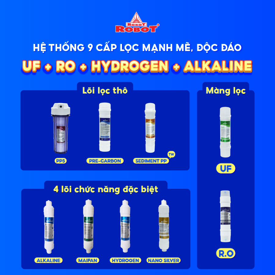 - Máy được tích hợp 2 công nghệ lọc tối ưu nhất hiện nay là UF (Ultrafiltration) & R.O (Reverse Osmosis) cho nguồn nước sau lọc sạch tối đa, được loại bỏ hoàn toàn cặn bẩn hay chất gây hại. Hệ thống đa cấp lọc mạnh mẽ của ROBOT ALPHA PRO 9GK-UR