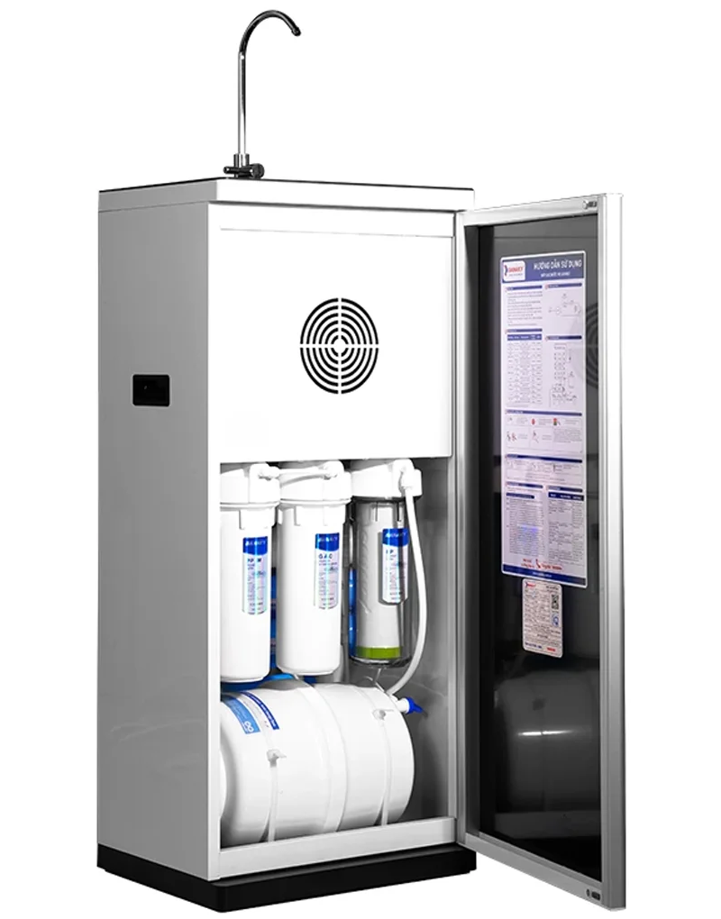 Tổng quan - Kiểu lắp đặt:Tủ đứng - Loại máy:Máy lọc nước RO nóng nguội lạnh - Công nghệ lọc:Thẩm thấu ngược RO - Kháng khuẩn:Nano Silver - Dung tích bình chứa:Tổng 7.8 lít (Nước nóng 0.8 lít, nước lạnh 1 lít, nước thường 6 lít) - Tỷ lệ lọc - thải:Lọc 4.8 - Thải 5.2 (Tỷ lệ này phụ thuộc vào chất lượng nước đầu vào) - Công suất lọc:18 lít/giờ - Công suất tiêu thụ điện trung bình khoảng:0.628 kW/h - Nhiệt độ nước hãng công bố:Nóng 80 - 90°C, Lạnh 10°C - Nhiệt độ nước thực tế:Nóng 80 - 90°C, Lạnh 10°C - Áp lực nước yêu cầu:0.07 - 0.25 MPa - Nơi sản xuất máy bơm:Trung Quốc - Năm ra mắt:2023 - Thương hiệu:Việt Nam - Nơi sản xuất:Việt Nam Thông tin lõi lọc - Số lõi lọc:10 lõi -
