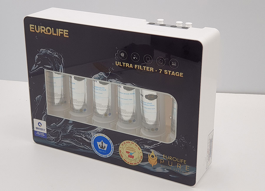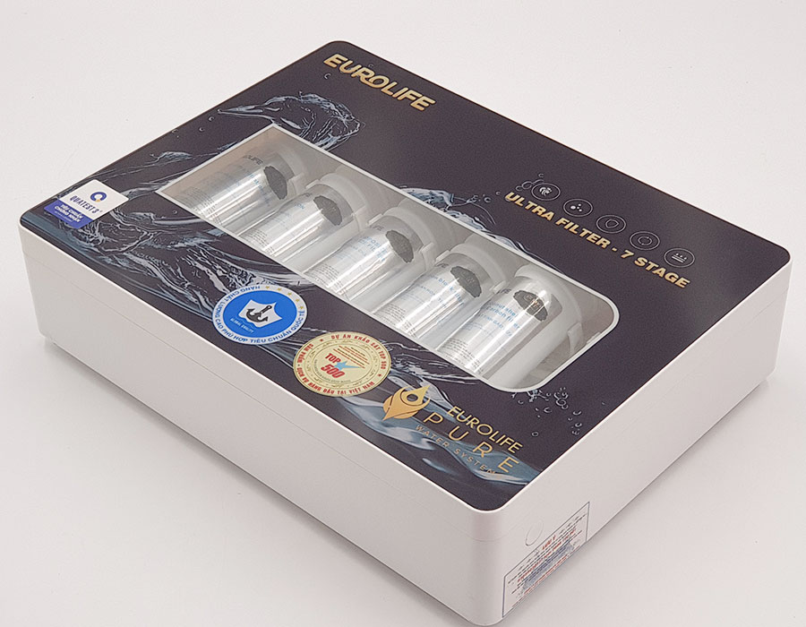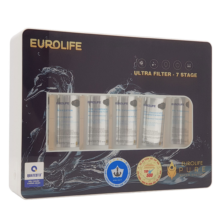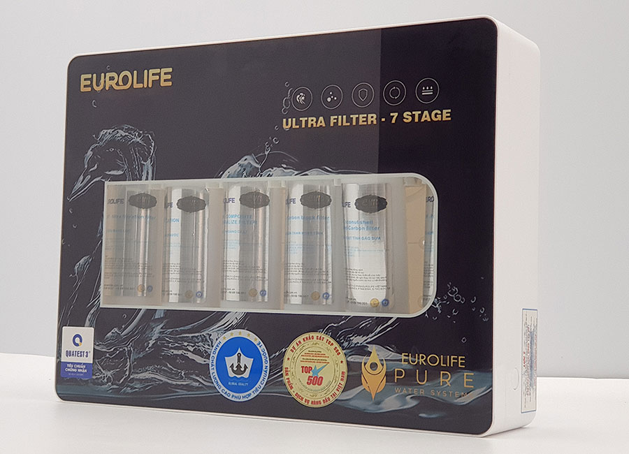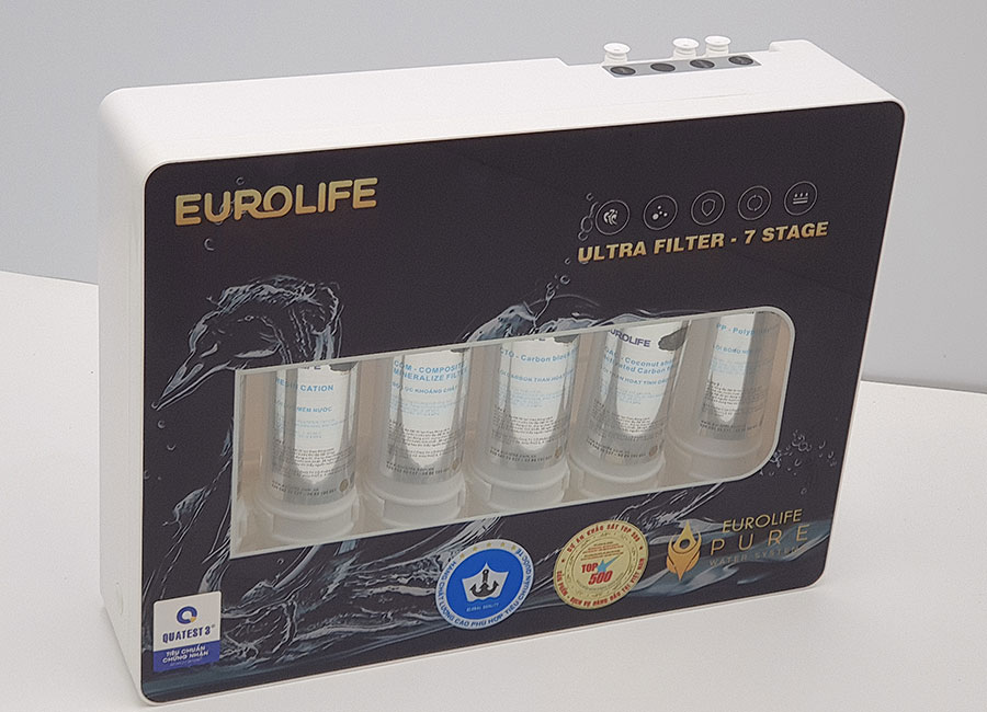 - Lõi Resin ( Lọc mềm) Chức năng: được cấu tạo từ hạt nhựa trao đổi Ion Cation, lõi lọc có khả năng loại bỏ kim loại nặng, chất tẩy rửa, chất hữu cơ và các hoá chất độc hại. Ngoài ra lõi lọc còn có khả năng trao đổi Ion, giữ lại các yếu tố làm nước cứng gây tắc màng như Ca, Mg,.. THIẾT KẾ VƯỢT TRỘI Máy lọc nước Eurolife EL-UF7 được thiết kế với 7 lõi lọc, được định vị chắc chắn trong Panel bằng nhựa PVC cao cấp và mặt kiếng sáng bóng dễ dang lau chùi vệ sinh. Mặt sau được thiết kế với 2 khoen treo đơn giản, dễ dàng lắp đặt. Máy có 3 đầu kết nối : Nước cấp vào, nước xả thải và nước đã lọc. Được phân biệt rõ ràng, dễ kết nối Bạn có thể lắp ngay dưới gầm chậu rửa chén để tiết kiệm không gian và tiện dụng hơn. PHỤ KIỆN ĐI KÈM Phụ kiện kèm Máy lọc nước uống trực tiếp 5 cấp độ lọc Eurolife EL-UF5 bao gồm: Thân máy đã lắp lõi lọc 01; Vòi và phụ kiện 01; Van nối dây và vòi nước ra 01; Ống dẫn nước 04m; Bát gắn vòi 01; Hướng dẫn sử dụng 01; Bộ chia đầu vào 01; Phiếu bảo hành 01; Ốc vít 05; Van khóa 01. Sản phẩm được đi kèm với vòi xả cùng các van đấu nối. LẮP ĐẶT ĐƠN GIẢN Sản phẩm không thể thiếu cho mỗi căn bếp Việt ! Hãy chăm lo sức khỏe của người thân và gia đình của bạn ngay hôm nay, bắt đầu từ nguồn nước thuần khiết mà Eurolife sẽ mang lại cho bạn. Hãy trải nghiệm cùng sản phẩm thương hiệu Eurolife để cảm nhận giá trị chúng tôi mang lại cho khách hàng. Chất lượng, uy tín và dịch vụ hậu mãi tốt luôn là cam kết của chúng tôi. CHẤT LƯỢNG HÀNG ĐẦU Thương hiệu Eurolife Việt Nam là một thương hiệu uy tín hàng đầu trên thị trường Việt Nam với 12 năm kinh nghiệm Các sản phẩm Eurolife đạt nhiều chứng chỉ uy tín trong nước như :