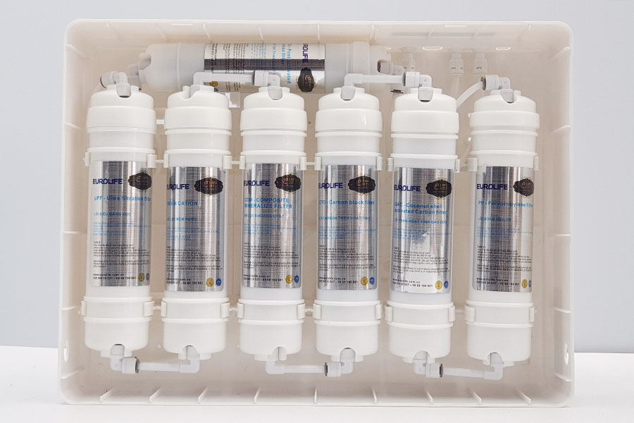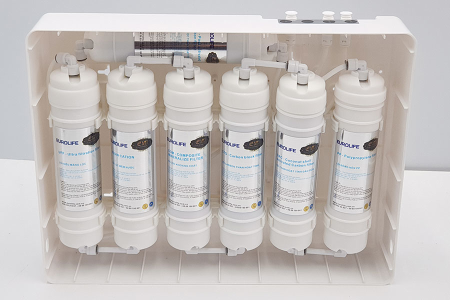 - 7 cấp độ lọc tiên tiến Máy bao gồm 7 cấp độ lọc : PP, GAC, COM, UFF, T33, CTO, RESIN. Tăng cường khả năng diệt khuẩn lên đến 100%, loại bỏ rỉ sét, kim loại nặng, các tạp chất, hóa chất ... trong nguồn nước. Nước lọc qua máy UF của Eurolife đạt tiêu chuẩn nước uống đóng chai : Theo QCVN-6-1:2010/BYT do Quatest 3 xét nghiệm và so sánh. TÍNH NĂNG LỌC NƯỚC Loại bỏ tạp chất, thành phần hóa học, ô nhiễm, độc hại, clo, diệt khuẩn, vi sinh… Loại bỏ kim loại nặng như: chì, cadmium, đồng .... Làm mềm nước, thay đổi cấu trúc khoáng dễ hấp thụ hơn cho cơ thể con người (nằm trong tiêu chuẩn cho phép) phòng tránh các bệnh thiếu canxi, thiếu khoáng, sỏi thận, tắc nghèn đường ruột, cải thiện vị nước, thức ăn. Hấp thụ asen, amoni, các dạng khí hoá lỏng tốt hơn nhờ cơ chế lọc hấp thụ. Tiêu diệt được 99,9% vi khuẩn vi khuẩn, vi rút và mầm bệnh có hại. 1- LÕI PP (Polypropylene Filter)