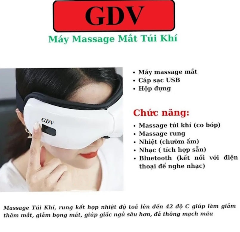 Thiết bị massage mắt thư giãn giảm điều tiết mắt kèm Bluetooth Túi Khí Massage, máy có nhiệt độ toả lên đến 42 độ C giúp làm giảm thâm mắt, giảm bọng mắt, giúp giấc ngủ sâu hơn, đả thông mạch máu