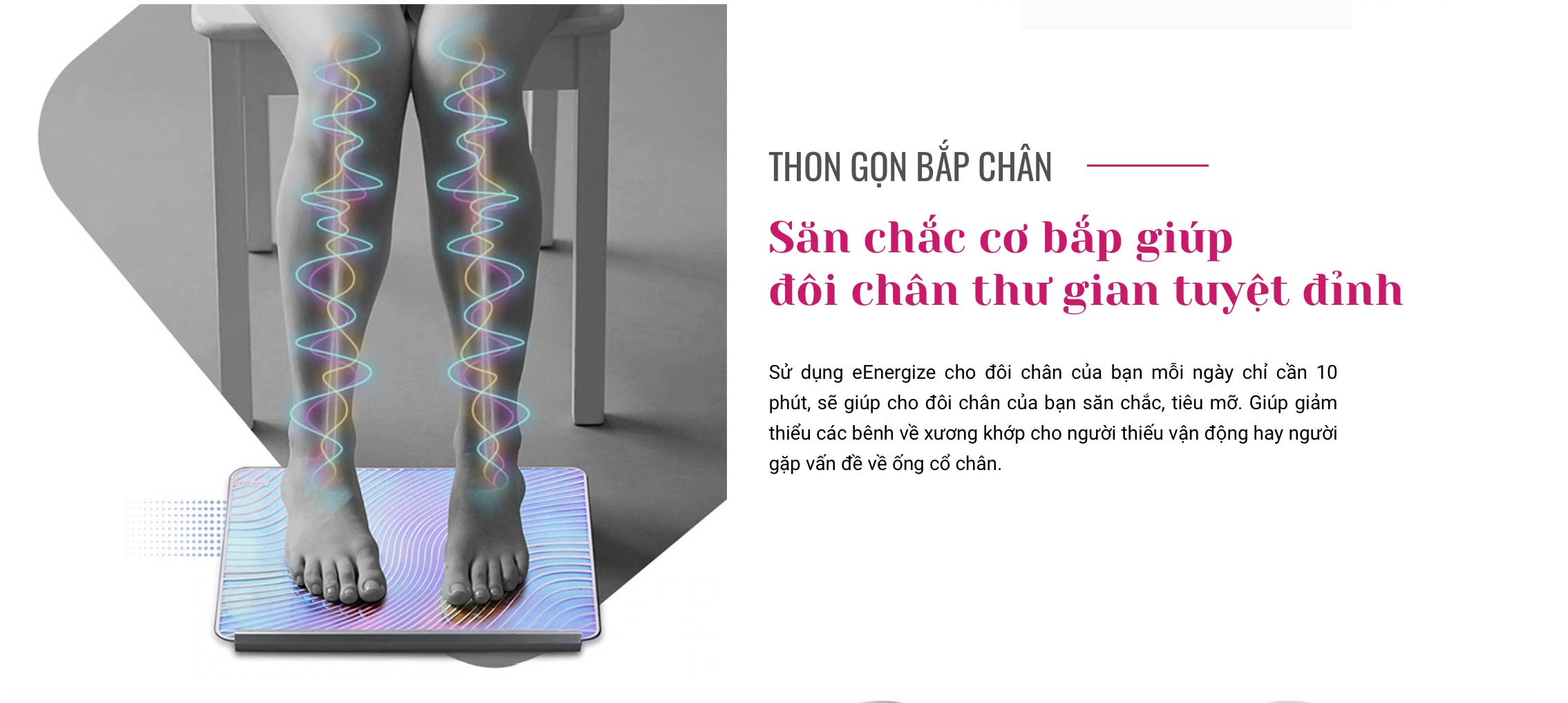 Massage xung điện tác động lên mô mỡ, giúp săn chắc cơ thể Nhiệt từ các xung điện tác động lên da làm tan các mô mỡ. Bằng cách massage xung điện, bạn có thể giảm mỡ thừa một cách đáng kể. Do đó, massage eo thường xuyên sẽ giúp bạn có một vòng eo thon gọn. Ngoài ra, OKIA eEnergize giúpmang lại đôi chân thon gọn nhờ massage bắp chân và toàn bộ cơ thể.