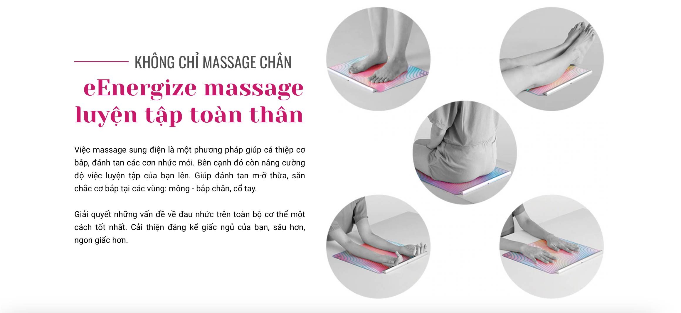 Máy massage xung điện OKIA eEnergize là thiết bị massage sử dụng công nghệ dòng điện sinh học EMS. Máy sử dụng dòng điện với tần số thấp tác động lên các vị trí đặt trên bề mặt tấm thảm. Dòng điện này kích thích sâu vào các thớ cơ, làm giảm căng cơ, xóa tan nhức mỏi. Ngoài ra, eEnergize tác động tới các điểm mạch và huyệt đạo thông qua dòng điện, tạo sự khác biệt với máy massage tác động vật lý rung xoay thông thường. Máy massage xung điện phù hợp cho những người đi lại nhiều hoặc ngồi lâu một chỗ dẫn đến nhức mỏi cơ và xương khớp,…