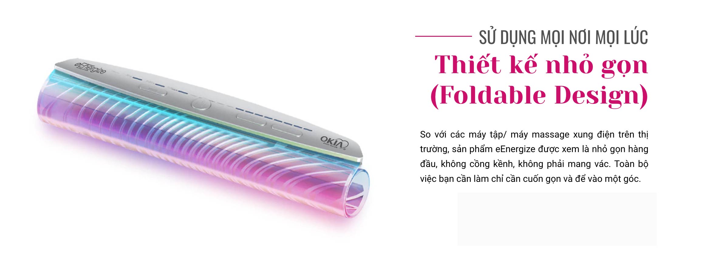 Nếu các máy massage xung điện thông thường có 4 – 8 miếng điện cực với dây lằng nhằng dán lên người khi massage,máy massage xung điện OKIA eEnergize là một tấm nhựa dẻo gắn liền với bảng điều khiển nên vô cùng nhỏ gọn, dễ dàng mang đi. Ưu điểm nổi trội của eEnergize là vô cùng êm ái, không có tiếng ồn khi sử dụng.