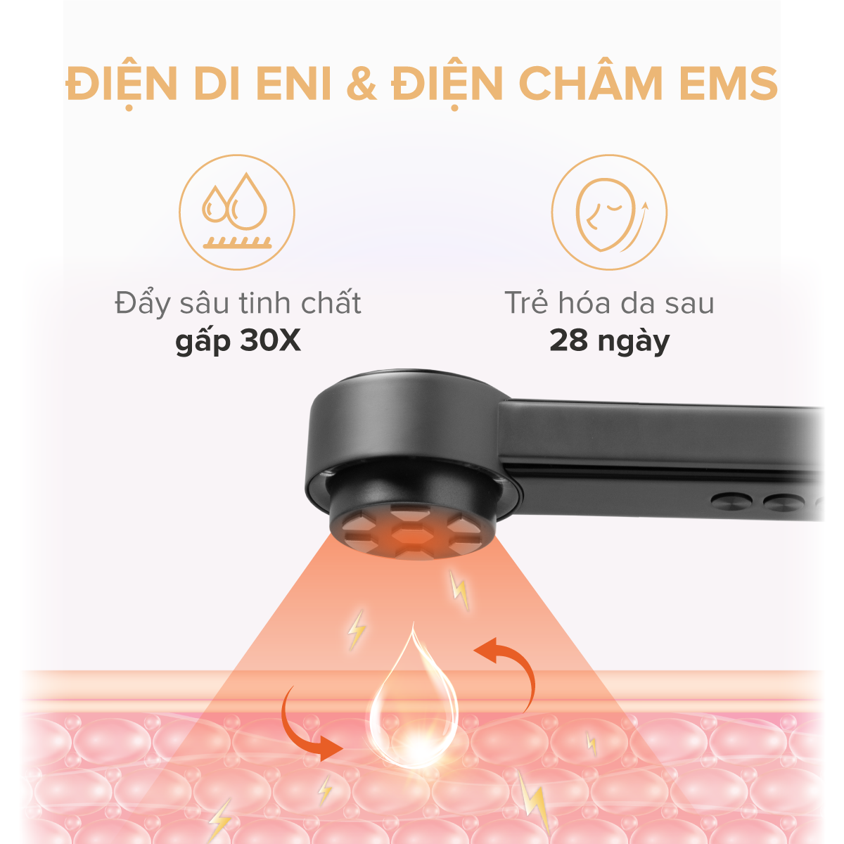 Điện di ENI tác động lên bề mặt da giúp đẩy các phân tử dưỡng chất vào sâu trong da tốt hơn gấp 15 lần.