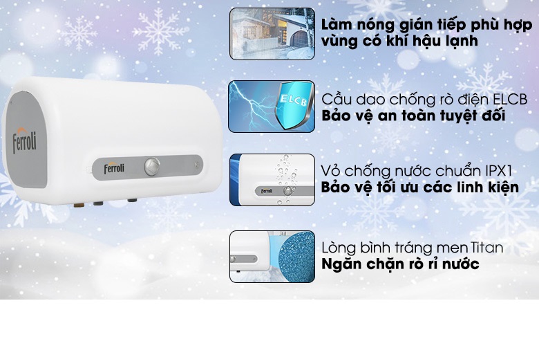Bình nước nóng gián tiếp Ferroli QQAE 30Lít - Bình tráng Titan siêu bền bảo hành dài hạn - Lớp phủ men xanh vĩnh cửu - Thanh nhiệt tráng men siêu bền, chống bám cặn