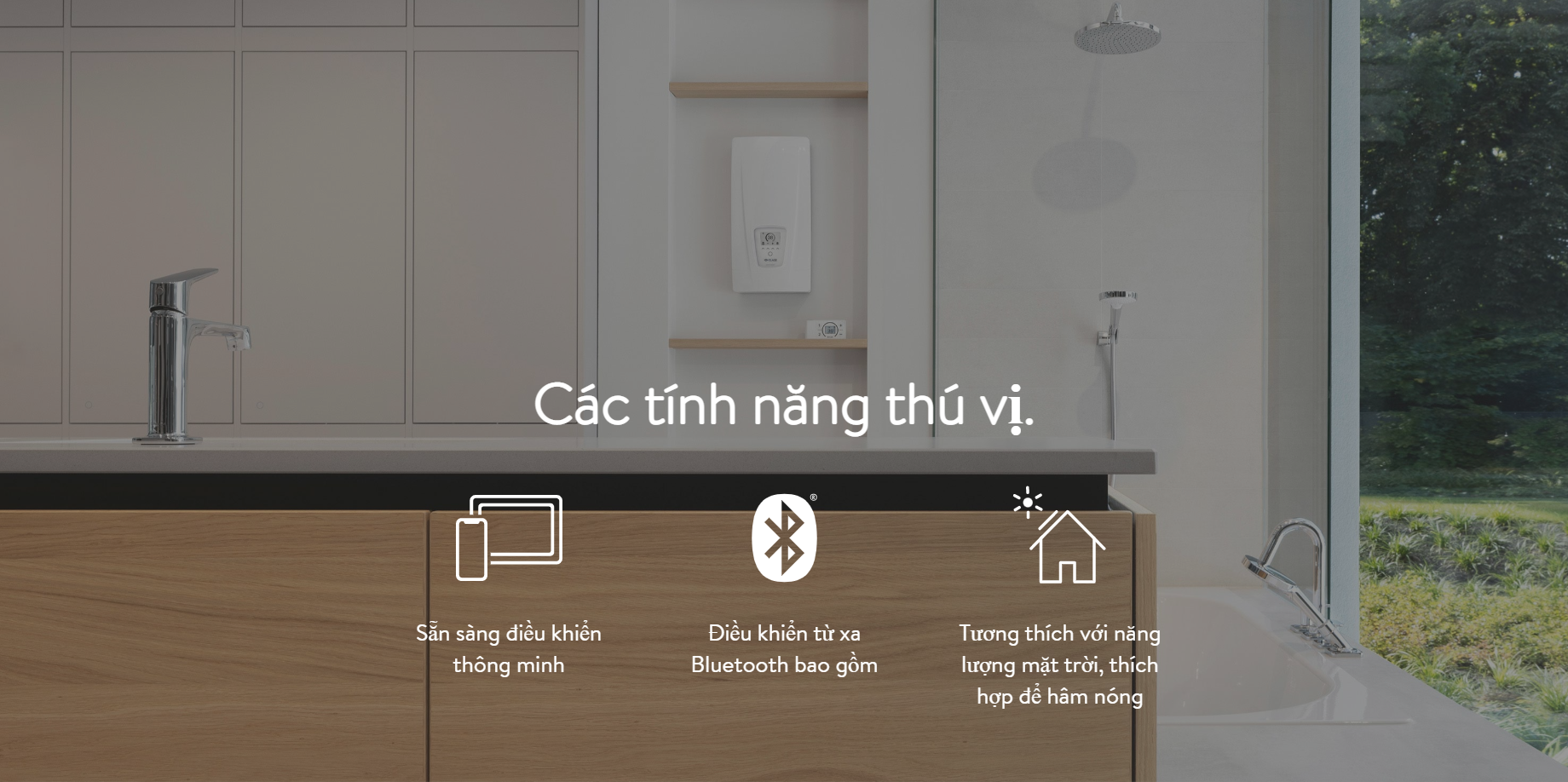 Bình nước nóng trực tiếp duy nhất trên thị trường lắp trong tủ bếp, dưới kệ bếp rất gọn, không nhỏ nước vanTrang bị chống giật RCD được chứng nhận bởi TUV Rheinland và CQC,