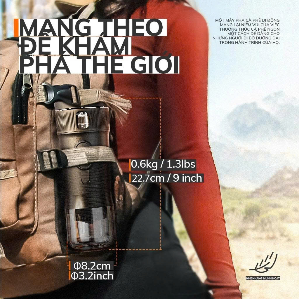 Thiết kế nhỏ gọn và tiện lợi. Chỉ với một nút nhấn, bạn có thể bắt đầu pha cà phê mà không cần thiết lập phức tạp. Thiết kế di động giúp máy pha cà phê nhẹ và dễ mang theo, cho phép bạn thưởng thức cà phê thơm ngon mọi lúc, mọi nơi, dù ở ngoài trời, trên đường hay trong văn phòng.