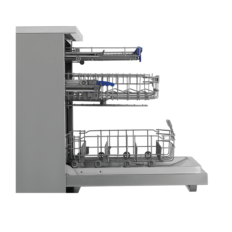 - Hệ thống 03 giàn linh hoạt, chứa được 15 bộ bát đĩa với 8 chương trình rửa