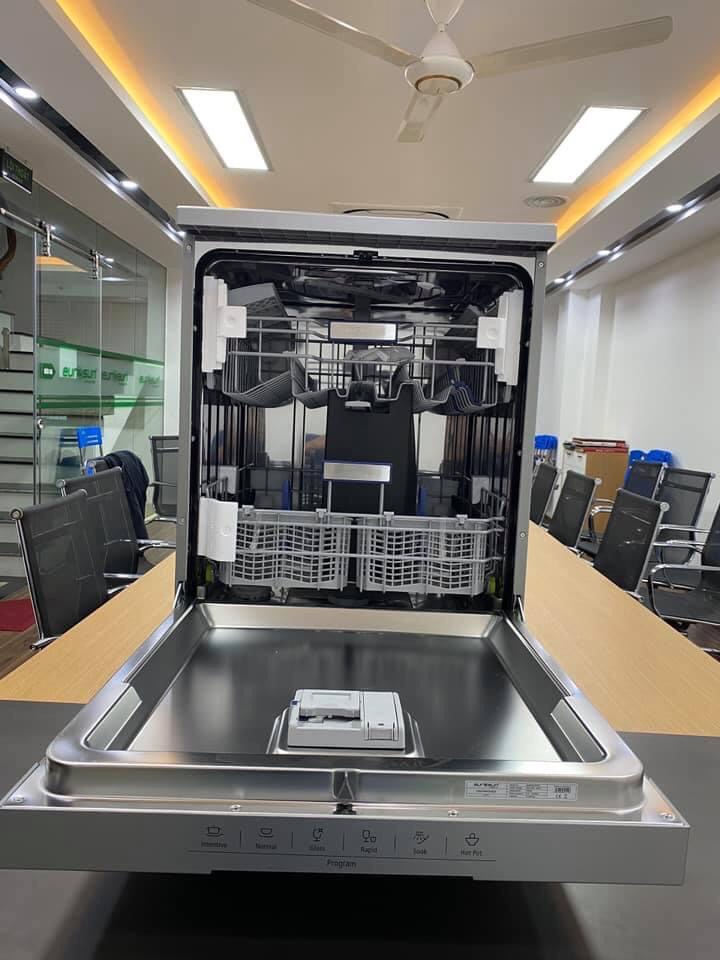 - Thiết kế bên trong gồm 2 ngăn chứa cơ động và 1 ngăn giỏ để dao kéo hoặc để đũa, dung tích của máy có thể chứa tới 14 bộ bát đĩa. Khay xếp bát đĩa đã được Eurosun nghiên cứu và thiết kế chuyên dụng dành riêng cho thị trường Châu Á chắc chắn và dễ sử dụng. Hệ thống giàn (khay) rửa có thể kéo ra dễ dàng rất thuận tiện cho việc sắp xếp đồ vào máy.