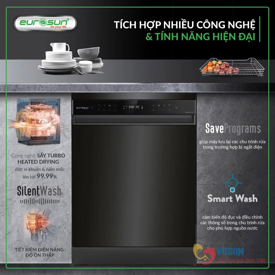 Công nghệ Sấy Turbo heated drying trang bị trên máy rửa bát EUROSUN sấy khô triệt để, diệt vi khuẩn và nấm mốc lên tới 99,99% làm cho các vật dụng luôn khô ráo giúp bảo vệ an toàn sức khỏe gia đình bạn.