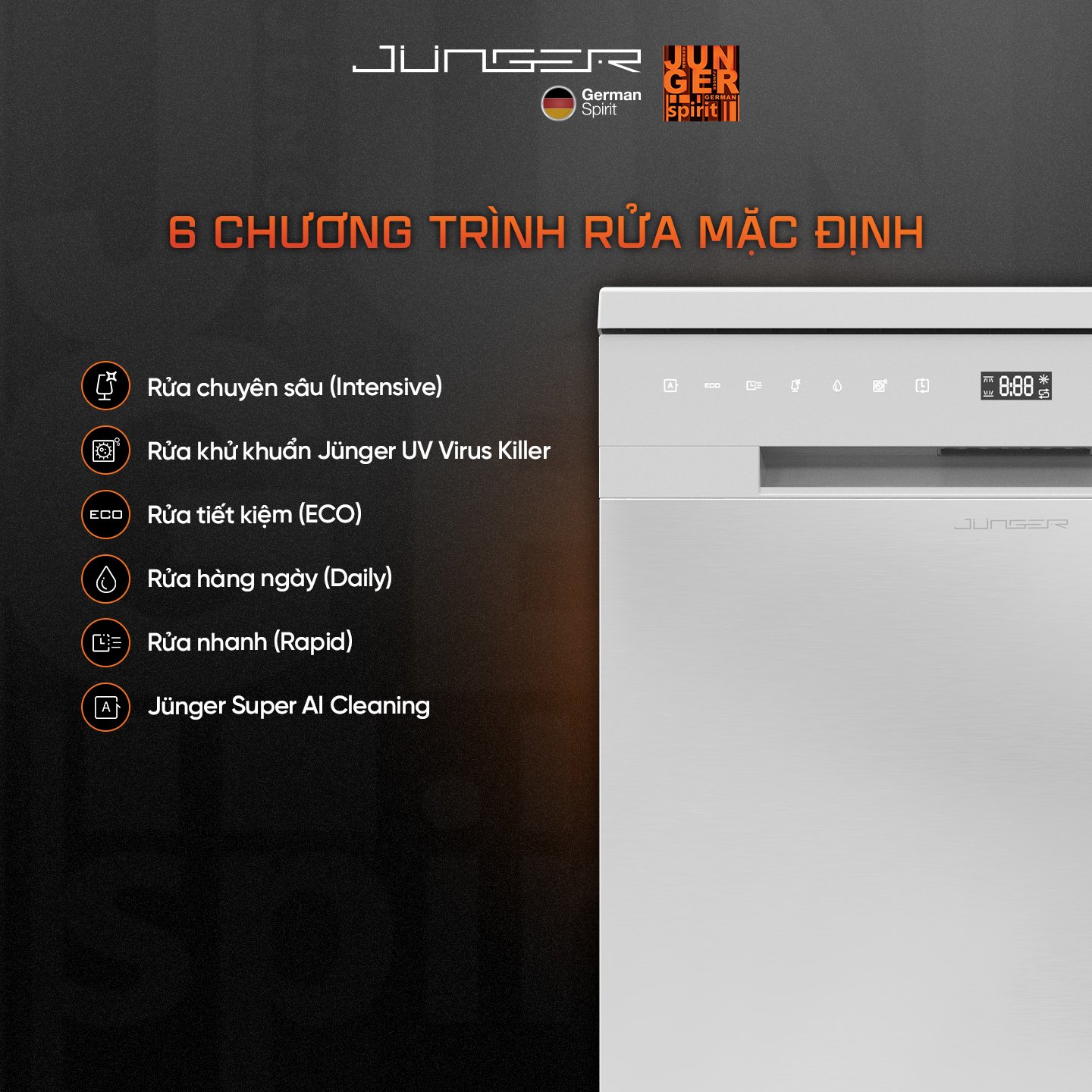 - 6 chương trình rửa tiện lợi Máy rửa bát Junger được trang bị 6 chương trình rửa mang đến cho người dùng nhiều lựa chọn: rửa chuyên sâu (Intensive), rửa khử khuẩn Junger UV Virus Killer, rửa tiết kiệm (ECO), rửa hàng ngày (Daily), rửa nhanh (Rapid) và Junger Super AI Cleaning phù hợp với nhu cầu của mọi gia đình.
