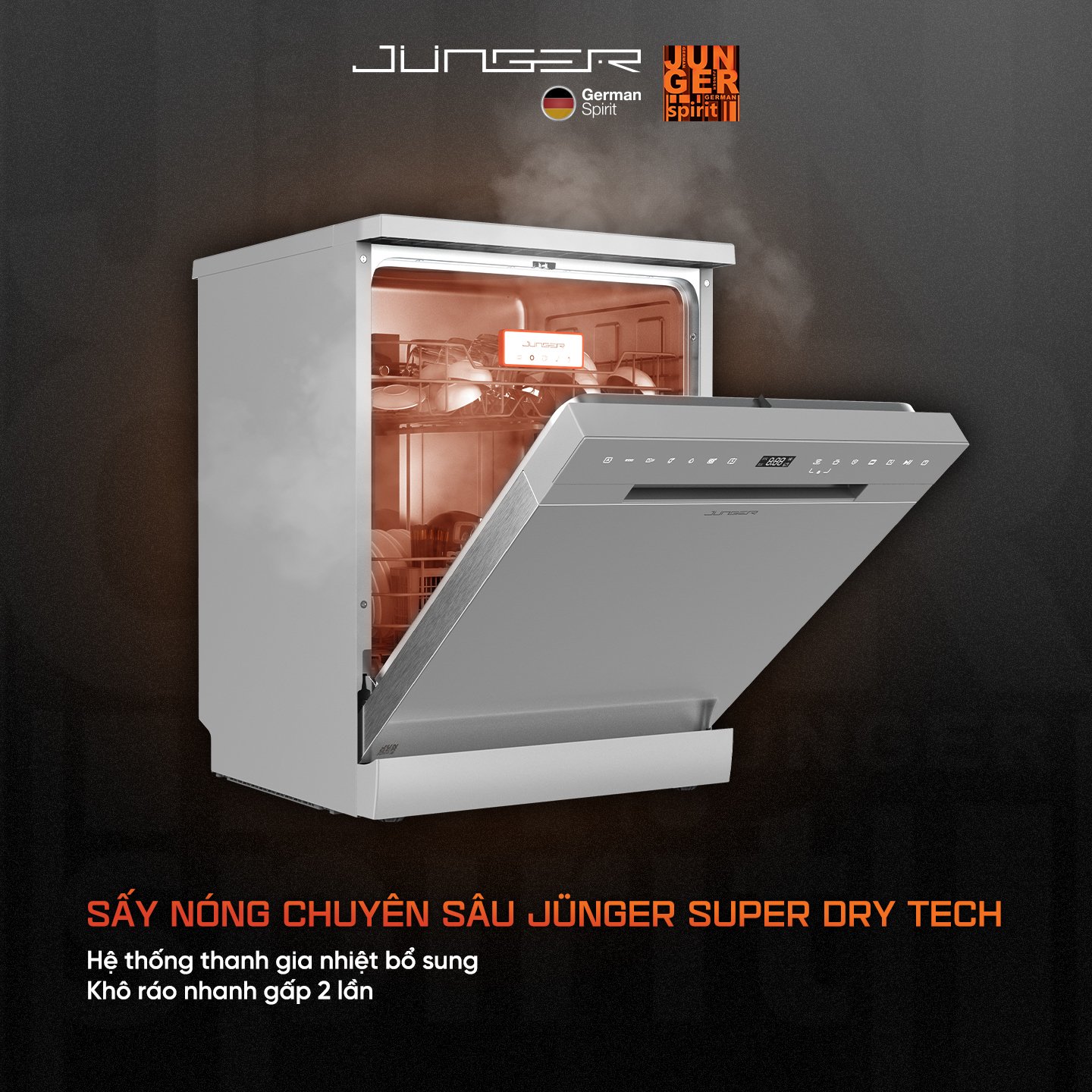 - 5 công nghệ hiện đại chuẩn đẳng cấp Đức Vượt trội so với các sản phẩm cùng loại trên thị trường, Junger DWJ-140 được ứng dụng 5 công nghệ hiện đại bao gồm: công nghệ sấy nóng Junger Super Dry Tech, công nghệ AI tự động Junger Super AI Cleaning, công nghệ khử trùng/diệt khuẩn bằng tia UV Junger UV Virus Killer Tech, công nghệ khử mùi bằng gió tươi đối lưu Fresh Air, và công nghệ rửa nửa tải Half Load.