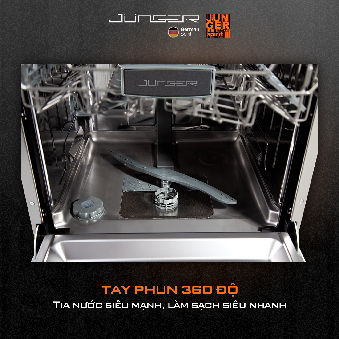 Máy rửa bát Junger được trang bị hệ thống phun nước ở cả 3 giá chứa đồ trên, giữa và dưới giúp tối ưu hóa lưu thông nước cho kết quả rửa hoàn hảo. Hệ thống tay phun mang nước đến mọi góc của khoang rửa mà không bỏ sót bất kỳ vị trí nào. Hai cánh tay phun phía trên kết hợp với tay dưới đảm bảo làm sạch hoàn hảo sáng bóng.