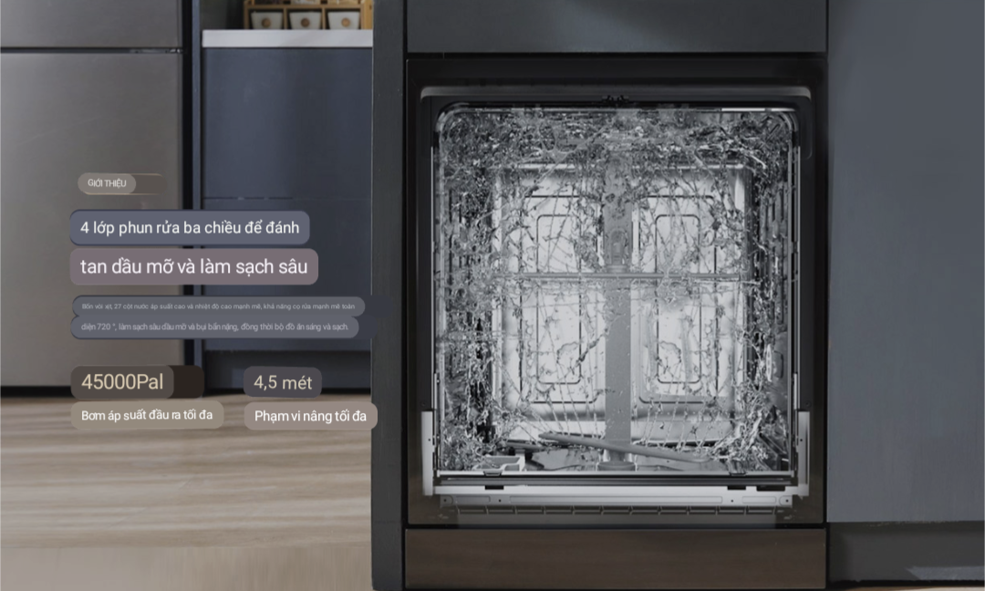 Nhờ công nghệ phun với hệ thống 4 tầng phun rửa và 27 vòi phun nước áp suất cao mạnh mẽ, khả năng rửa mạnh toàn diện 720°, máy rửa bát Mijia S1 VDW1501M hoàn toàn làm sạch sâu tới 99,99% các vết mỡ, dầu nặng giúp bộ bát đũa sạch sẽ, và luôn sáng sủa.