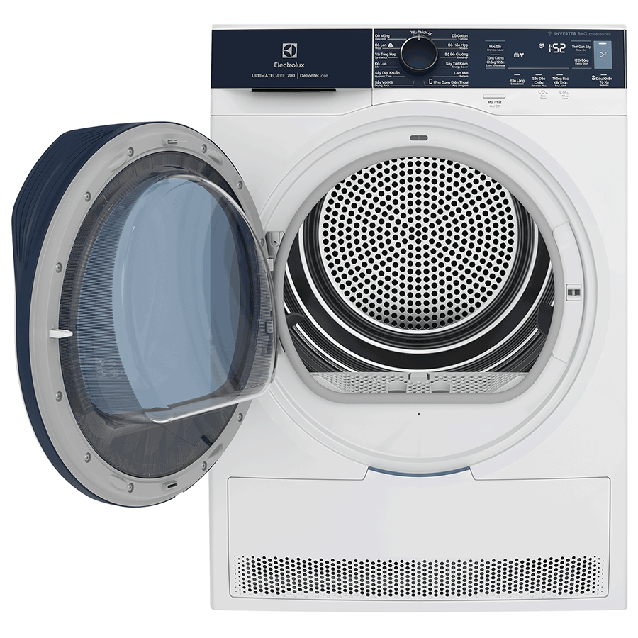 Nếu dùng cho hoạt động kinh doanh (giặt ủi, nhà hàng, khách sạn...) chỉ bảo hành 9 tháng. Bảo hành chính hãng máy giặt 2 năm, có người đến tận nhà Đặc điểm nổi bật - Máy sấy bơm nhiệt với khối lượng sấy 9 kg, lý tưởng cho các gia đình có từ 3 đến 5 thành viên. - Công nghệ Inverter cho khả năng tiết kiệm điện hiệu quả và vận hành một cách tối ưu. - Chế độ sấy diệt khuẩn Hygiene giúp quần áo luôn sạch sẽ, bảo vệ làn da hiệu quả. - Công nghệ SensiCare với cảm biến thông minh bảo vệ sợi vải tối ưu. - Công nghệ ColourCare mang lại hiệu quả sấy khô tuyệt vời mà vẫn giữ màu sắc của vải lâu bền. - Cảm biến 3DSense đo độ ẩm của vải và điều chỉnh thời gian sấy phù hợp giúp làm khô đồng đều và bảo vệ sợi vải. - Công nghệ sấy đảo chiều Reverse Tumbling ngăn ngừa nhăn và rối cho quần áo. Loại máy:Sấy bơm nhiệt - Khối lượng sấy:9 Kg - Số người sử dụng:Từ 3 - 5 người - Inverter:Có Inverter - Động cơ:Truyền động gián tiếp (Dây curoa) - Nhiệt độ sấy tối đa:Từ 55 - 60°C - Công suất tiêu thụ:700W - Số chương trình hoạt động:13 chương trình - Tiện ích:Đồng bộ SyncDryĐiều khiển qua ứng dụng ElectroluxTăng cường chống nhăn Extra AnticreaseTùy chỉnh thời gian và mức độ sấySấy diệt khuẩn HygieneKết nối từ xa Remote StartKhóa trẻ emHẹn giờ hoàn thànhHiển thị bằng màn hình đèn LEDCông nghệ Woolmark dành để sấy riêng cho đồ lenCông nghệ sấy siêu im lặng Extra SilentCông nghệ SensiCare chăm sóc quần áo tránh bị hư tổnCông nghệ DelicateCare bảo vệ đồ len không bị biến dạngCông nghệ ColourCareChế độ Refresh loại bỏ mùi ẩm mốcChương trình sấy đồ hỗn hợp thông minh MixedDryChương trình sấy đồ mỏngChuông báo lấy quần áo khi kết thúcCảm biến độ ẩm 3DSense để điều chỉnh thời gian sấy phù hợpReverse Tumbling sấy đảo chiều chống nhăn, giúp áo quần không bị xoắn rốiĐèn chiếu sáng lồng sấyTạm dừng thêm quần áoTự khởi động lại khi có điện -