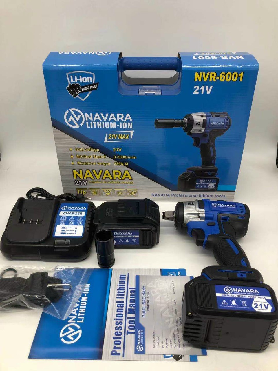 Phụ kiện bao gồm: 01 hộp máy, 01 thân máy, 02 pin, 01 sạc bàn pin tự ngắt khi đầy, 01 khẩu Φ22mm, 01 dây đeo