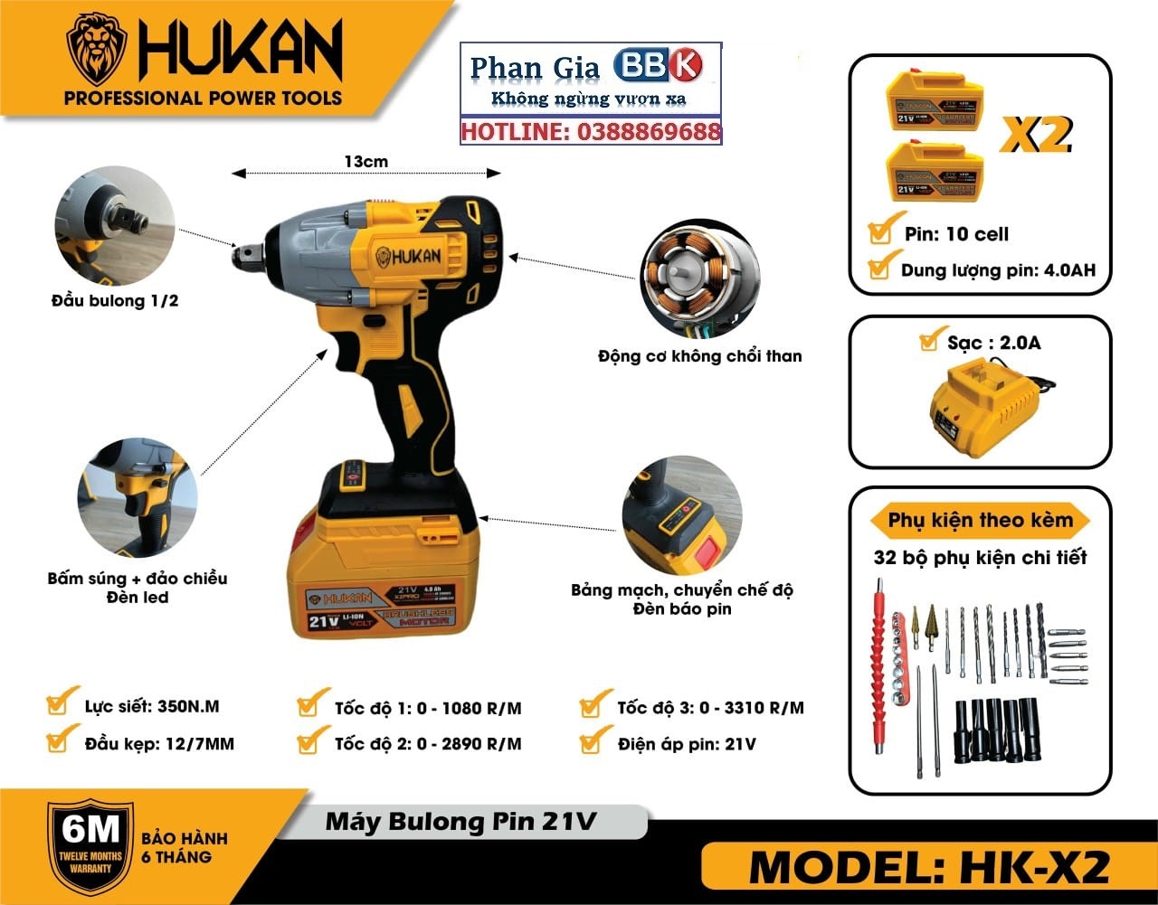 Giới thiệu Máy Siết Bulong HuKan X2 Promax 21v Công nghệ MỹTHÔNG SỐ KỸ THUẬT CỦA MÁY:- Chức năng: Siết mở Bulong, Ốc máy, Ốc nồi xe tay ga, Khoan, Bắt vít, Bắn tô- Đầu bulong 2 TRONG 1 (Vừa có thể ...