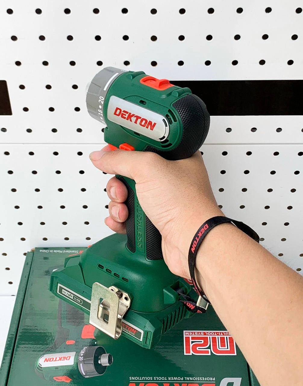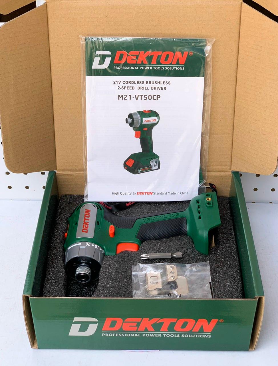 DEKTON là thương hiệu được bảo hộ tại Việt Nam, do công ty Thanh Xuân Nam sáng lập Tất cả các dòng máy dụng cụ cầm tay Dekton đươc sản xuất tại Trung Quốc, theo tiêu chuẩn của nhà sáng lập Việt Nam, sản phẩm Dekton tốt, có giá thành hợp lý khi bán ra cho người tiêu dùng Tất cả các máy dụng cụ cầm tay DEKTON trước khi đưa ra thị trường đều được kiểm tra kỹ lưỡng,được kiểm định về chất lượng, sản phẩm có thiết kế chắc chắn, 100% là Roto được làm bằng đồng, thân máy làm tự nhựa cao cấp. Thông số kỹ thuật -Model: M21-VT50CP -Bộ sản phẩm chỉ gồm thân máy -Hãng: Dekton -Sản Xuất: Trung Quốc -Sử dụng pin: 21V (Chân Pin Makita) -Loại pin: Lithium-ion -Motor Brushless -Chế độ khoan :Lực siết 50N -Chế độ bắt vít chia lực 20 cấp độ -Tốc độ không tải: Cao / Thấp: 0 – 1,1560 / 0 – 400 v/p -Khả năng khoan: Thép/ Gỗ: 12 / 34 mm -Trọng lượng tịnh: 0.64 kg -Bảo hành chính hãng 6 tháng