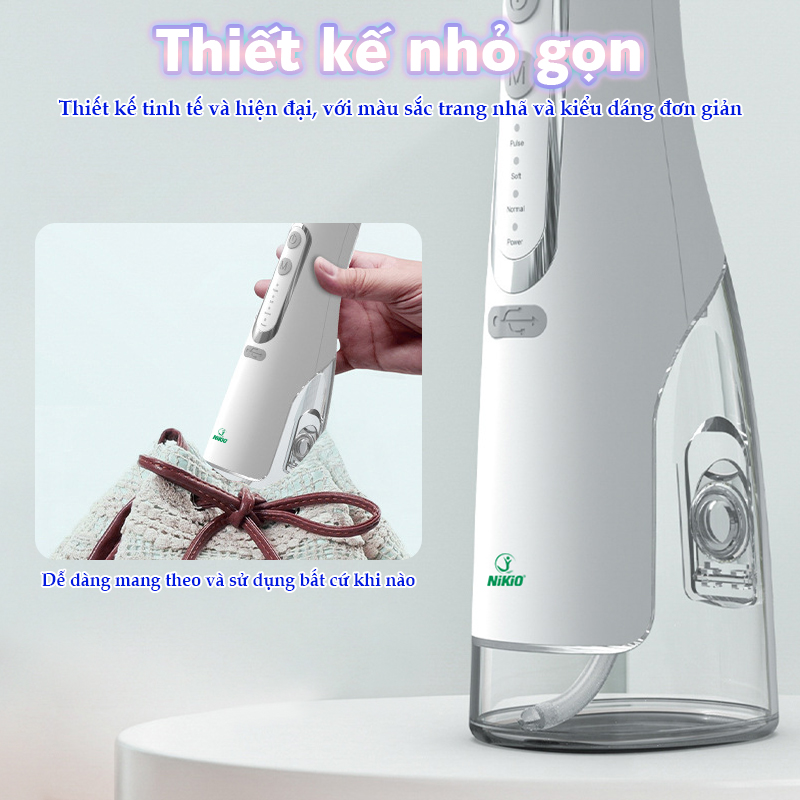 - Pin sạc dung lượng 1500mAh, thời gian sử dụng dài Ưu điểm của máy tăm nước làm sạch răng Nikio NK-M209: Áp lực nước mạnh mẽ, điều chỉnh linh hoạt Máy tăm nước mini dùng cho cá nhân Nikio NK-M209 được trang bị áp lực nước mạnh mẽ từ 40 - 120 PSI, giúp đánh bật thức ăn và mảng bám ngay cả ở những vị trí khó tiếp cận nhất. Người dùng có thể dễ dàng điều chỉnh 4 cường độ phun nước phù hợp với nhu cầu cá nhân để có thể làm sạch răng hiệu quả mà không làm đau nướu. Tia nước mịn 0.6mm – Làm sạch kẽ răng tối ưu Áp lực nước mạnh và tia nước siêu mịn với kích thước 0.6mm len lỏi vào từng kẽ răng, máy tăm nước Nikio NK-M209 có thể giúp bạn loại bỏ mảng bám và thức ăn dư thừa trong các kẻ răng hẹp mà không gây tổn thương nướu. Chức năng ghi nhớ cường độ phun thông minh Máy tăm nước làm sạch răng Nikio NK-M209 tích hợp chức năng ghi nhớ cường độ phun, giúp bạn tiết kiệm thời gian điều chỉnh ở những lần sử dụng tiếp theo. Vòi phun thiết kế đột phá xoay 360 độ Vòi phun của máy tăm nước cao cấp Nikio NK-M209 được thiết kế thông minh với khả năng xoay 360 độ. Sau khi đưa vòi phun vào miệng, góc của vòi có thể điều chỉnh theo ý muốn để làm sạch răng miệng một cách toàn diện không gốc chết. 4 đầu phun chuyên dụng thay đổi theo nhu cầu Máy tăm nước vệ sinh răng miệng Nikio NK-M209 được trang bị 4 loại đầu phun khác nhau, bao gồm đầu tiêu chuẩn, đầu chỉnh nha, đầu bàn chải và đầu cạo lưỡi. Người dùng có thể lựa chọn vòi phù hợp với nhu cầu sử dụng của mình. Việc sử dụng đúng loại vòi phù hợp với nhu cầu sẽ giúp việc vệ sinh răng miệng đạt hiệu quả cao.