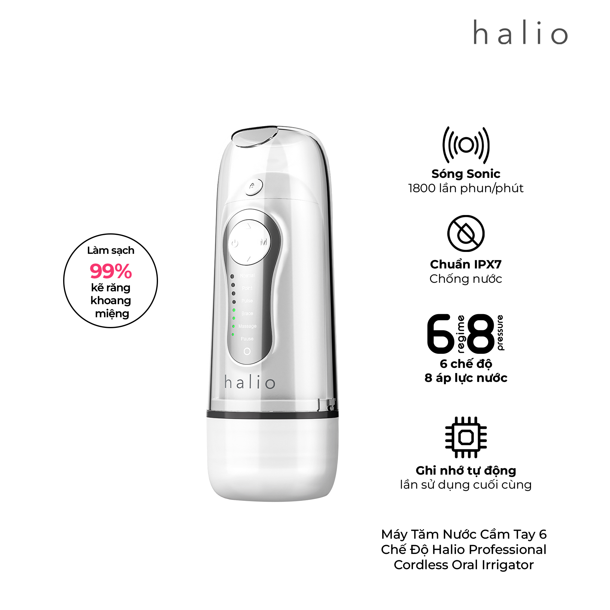 Mua tại TiktokMáy tăm nước cầm tay Halio Professional Cordless Oral Irrigator (tương thích với Bộ Đầu Tăm Nước Thay Thế 6 Chế Độ Halio Irrigator Replacement Jet Tip, Bình Chứa Nước Halio Professional Cordless Oral Irrigator và Dây Sạc Halio Professional Cordless Oral Irrigator) là sản phẩm vệ sinh răng miệng với sự kết hợp tiên tiến giữa áp lực nước và xung lực 1,800 lần phun/ phút loại bỏ đến 99,99% mảnh vụn thức ăn bám dính giữa các kẽ răng, giúp vệ sinh và chăm sóc răng miệng tối ưu. Máy tăm nước cầm tay Halio Professional Cordless Oral Irrigator giúp làm sạch răng hiệu quả hơn dùng tăm hay chỉ nha khoa, loại bỏ các vấn đề về răng nướu thường gặp như hôi miệng, nha chu, hạn chế sự hình thành cao răng. Thiết kế máy tăm nước cầm tay Halio: